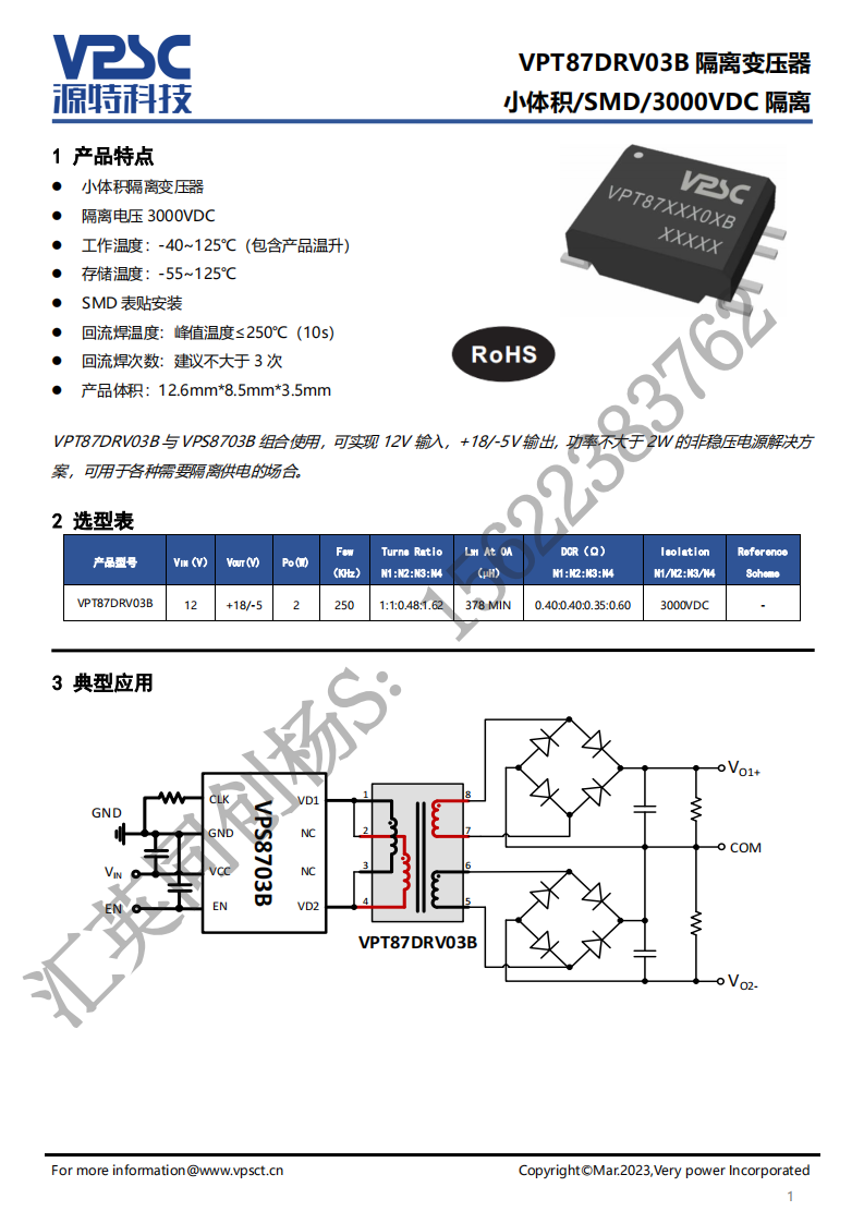 VPT87DRV03B与VPS8703B组合使用,可实现12V输入,+18/-5V输出,功率不大于2W的非稳压电源解决方案,可用于各种需要隔离供电的场合。