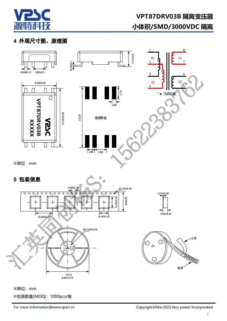 扫码加入VPT87DRV03B隔离变压器 小体积/SMD/3000VDC隔离