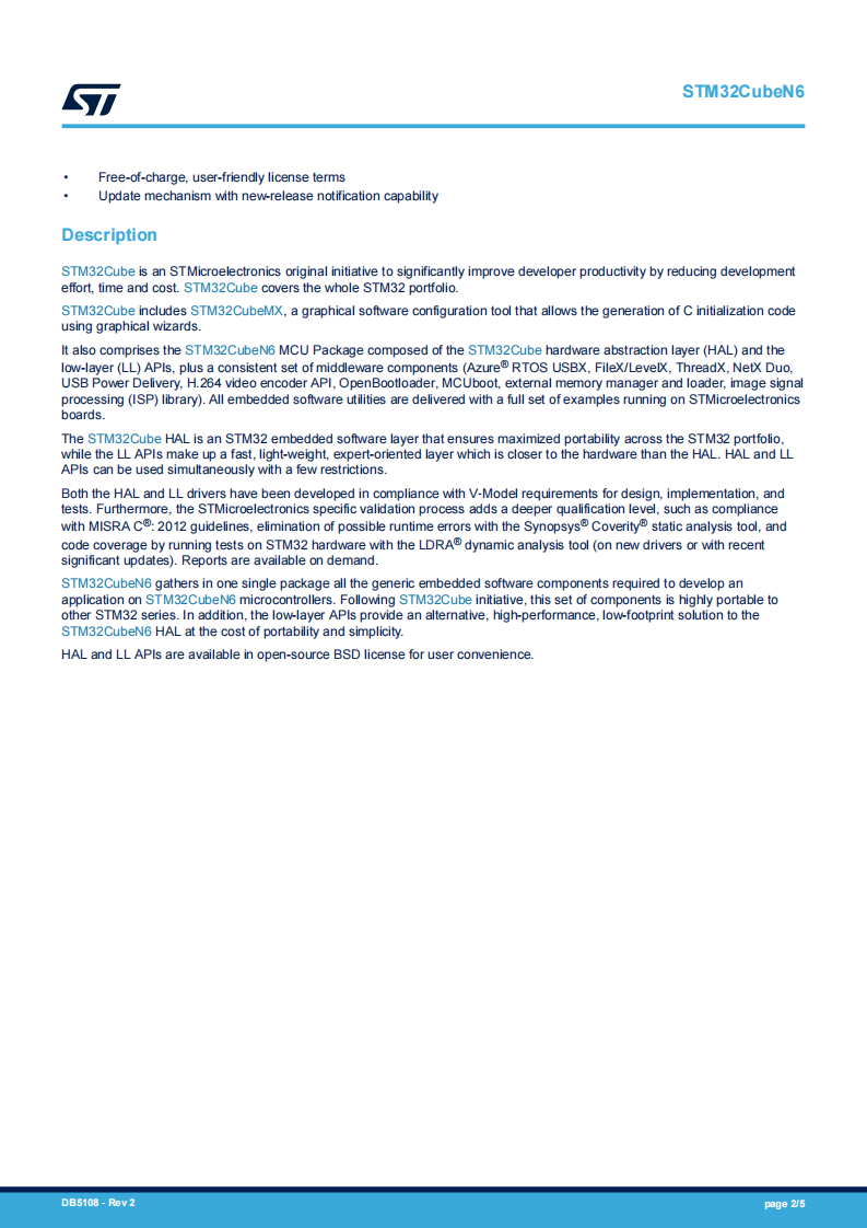 • HAL和LL API,按照MISRA C®: 2012指南开发,使用Synopsys® Coverity®静态分析工具消除可能的运行时错误,并通过在STM32硬件上运行测试,使用LDRA®动态分析工具进行代码覆盖率测试(针对新驱动程序或最近的重大更新)。