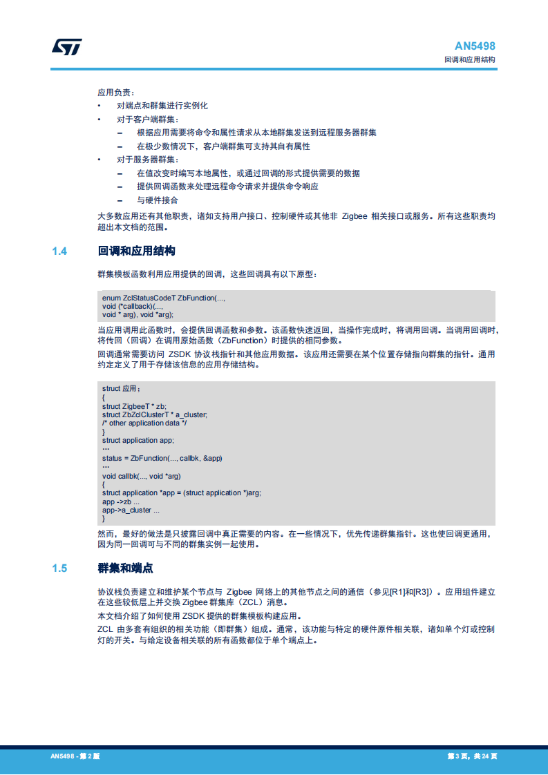 协议栈负责建立和维护某个节点与 Zigbee 网络上的其他节点之间的通信(参见[R1]和[R3])。应用组件建立在这些较低层上并交换 Zigbee 群集库(ZCL)消息。