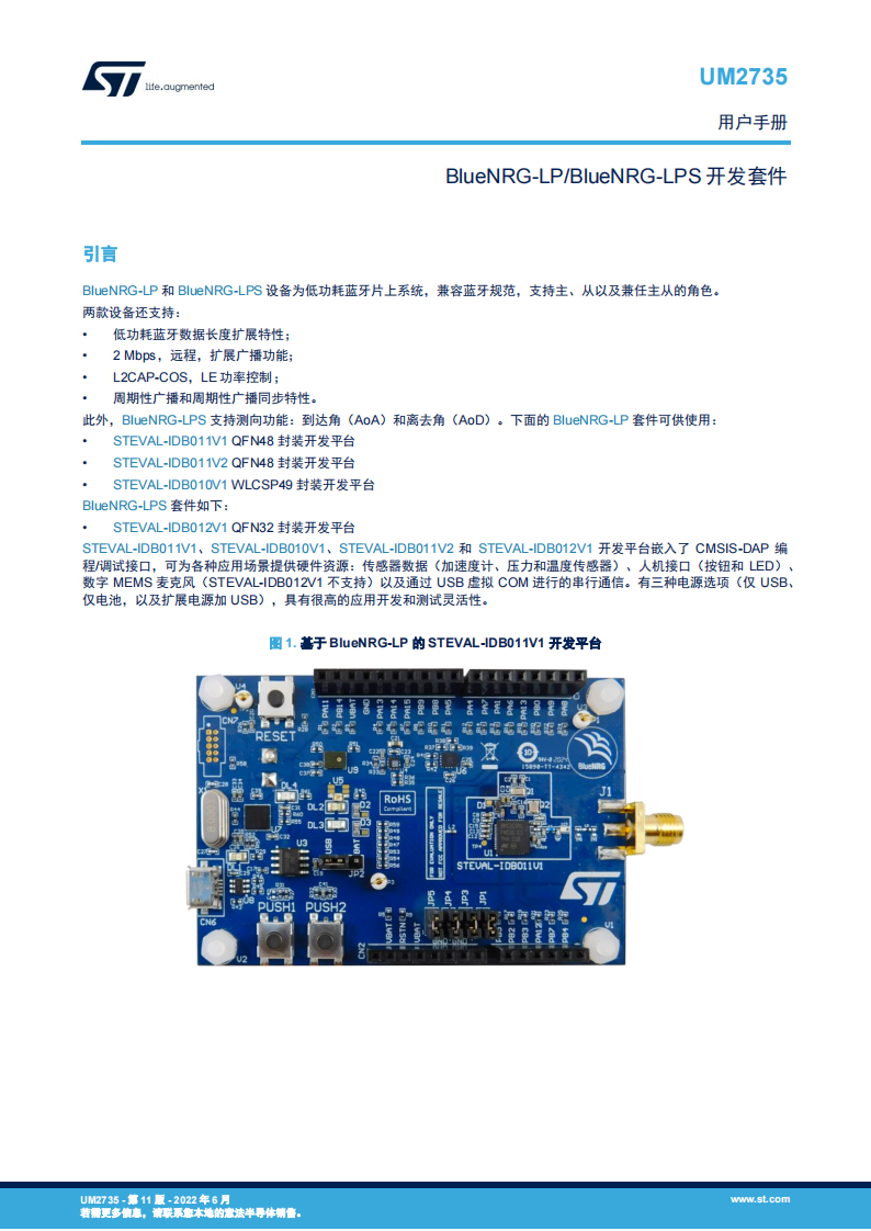 BlueNRG-LP 和 BlueNRG-LPS 设备为低功耗蓝牙片上系统,兼容蓝牙规范,支持主、从以及兼任主从的角色。