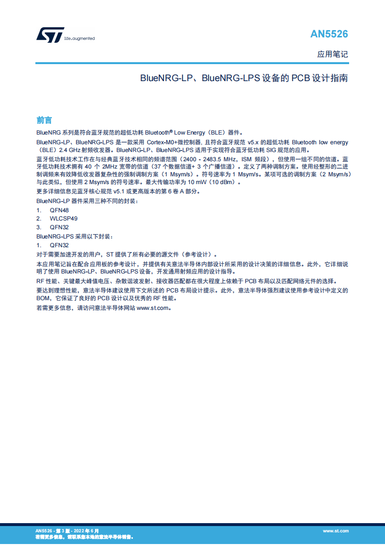 BlueNRG-LP、BlueNRG-LPS 是一款采用 Cortex-M0+微控制器, 且符合蓝牙规范 v5.x 的超低功耗 Bluetooth low energy(BLE)2.4 GHz 射频收发器。BlueNRG-LP、BlueNRG-LPS 适用于实现符合蓝牙低功耗 SIG 规范的应用。