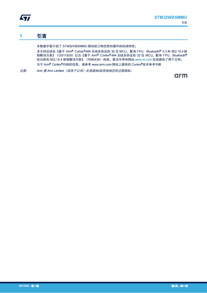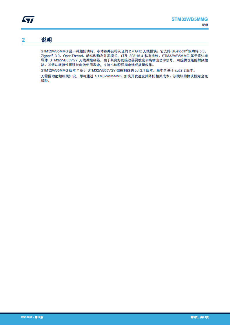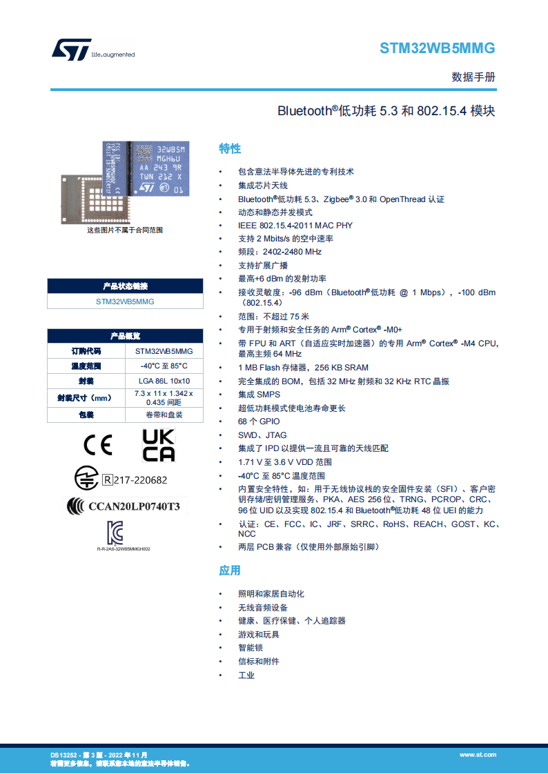 - 内置安全特性,如:用于无线协议栈的安全固件安装(SFI)、客户密钥存储/密钥管理服务、PKA、AES 256 位、TRNG、PCROP、CRC、96 位 UID 以及实现 802.15.4 和 Bluetooth®低功耗 48 位 UEI 的能力