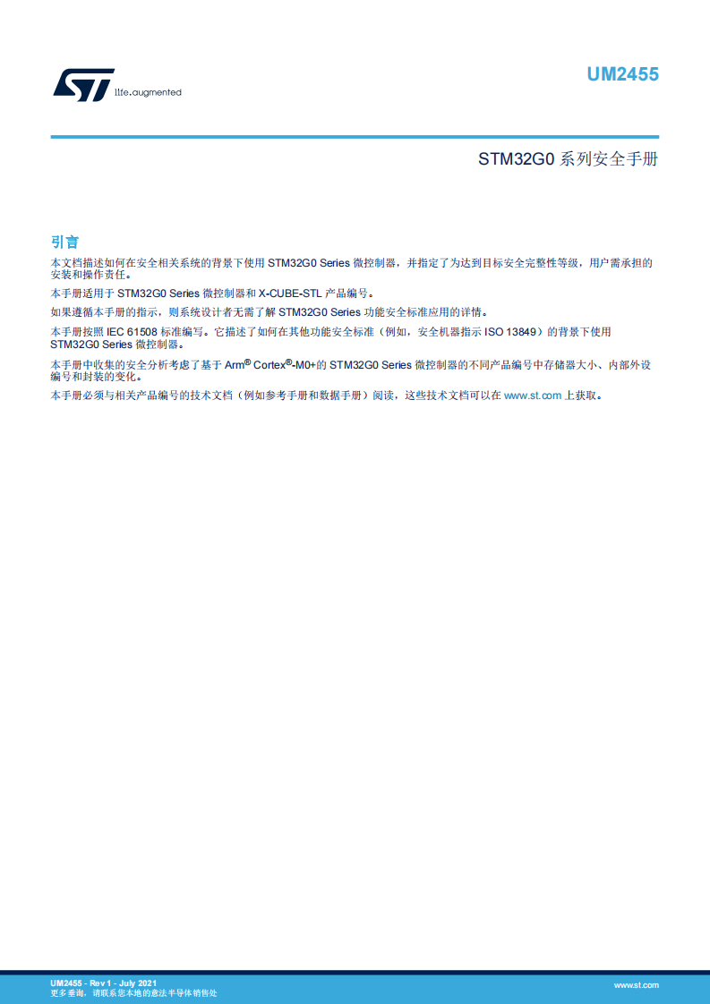 本手册适用于 STM32G0 Series 微控制器和 X-CUBE-STL 产品编号。