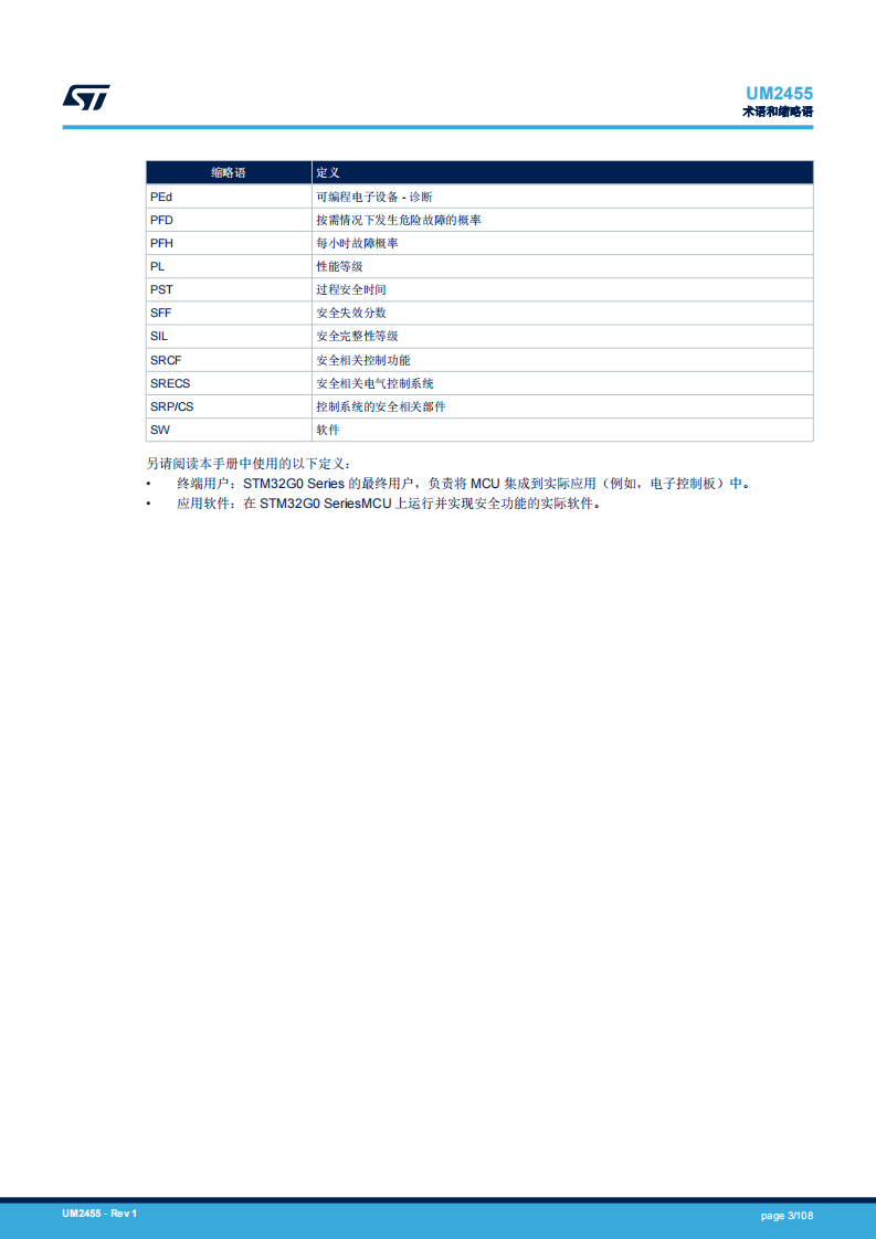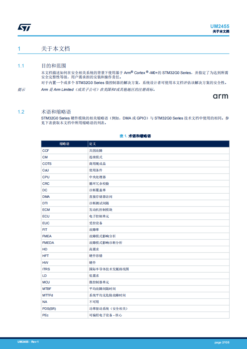 本文档描述如何在安全相关系统的背景下使用基于 Arm® Cortex ® -M0+的 STM32G0 Series,并指定了为达到所需安全完整性等级,用户需承担的安装和操作责任。