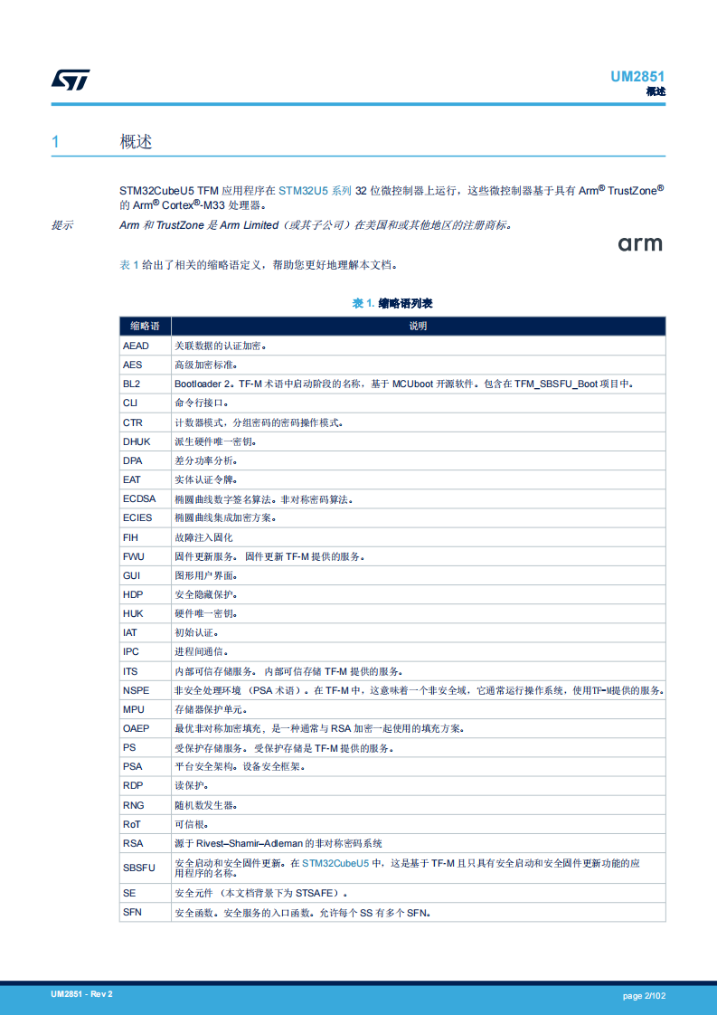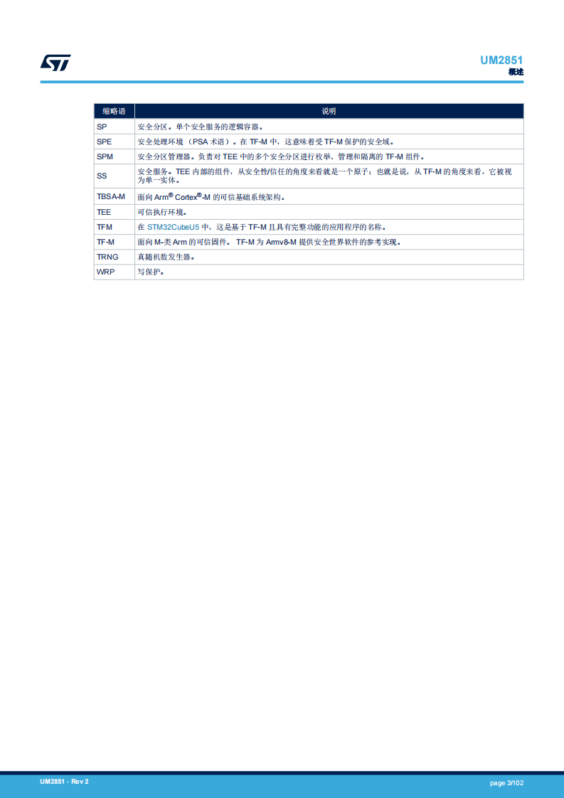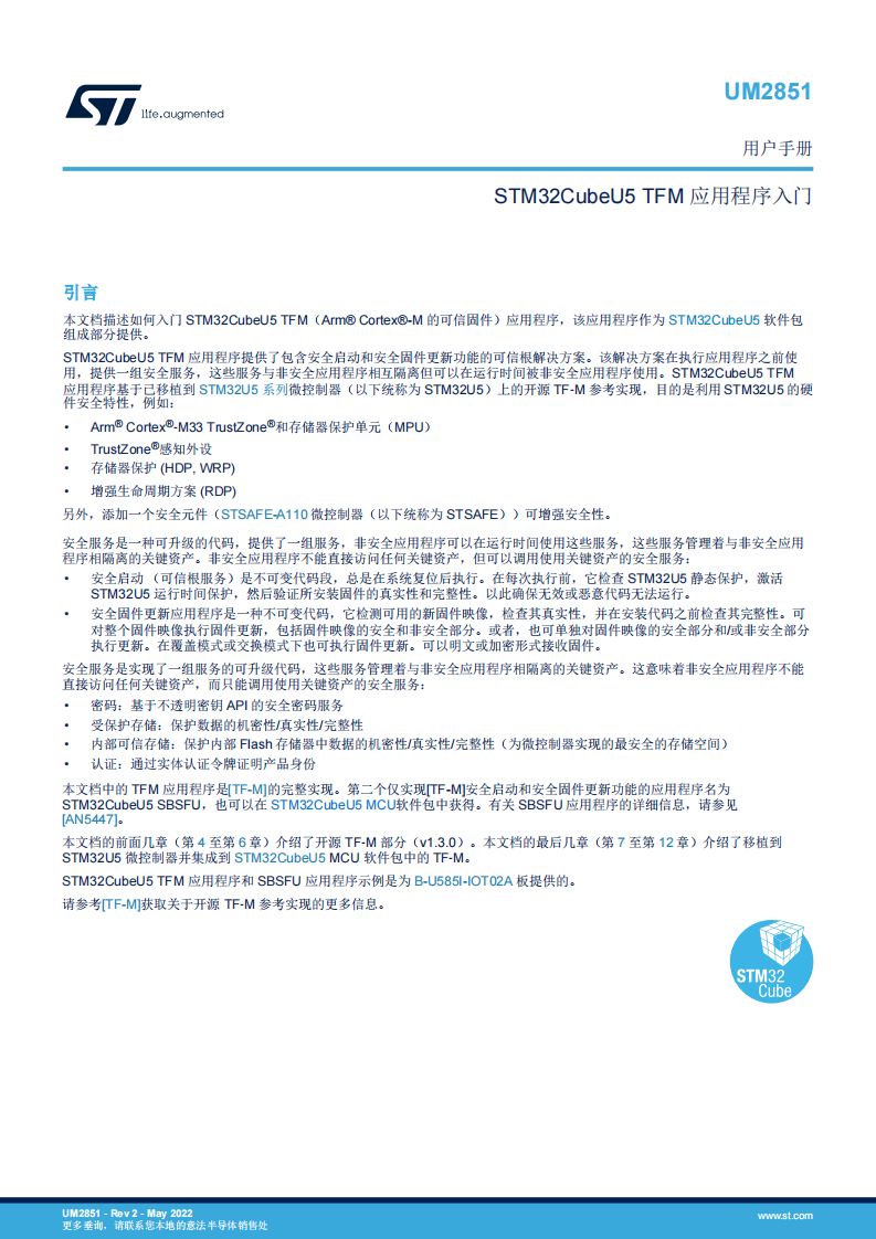 本文档中的 TFM 应用程序是[TF-M]的完整实现。第二个仅实现[TF-M]安全启动和安全固件更新功能的应用程序名为STM32CubeU5 SBSFU,也可以在 STM32CubeU5 MCU软件包中获得。
