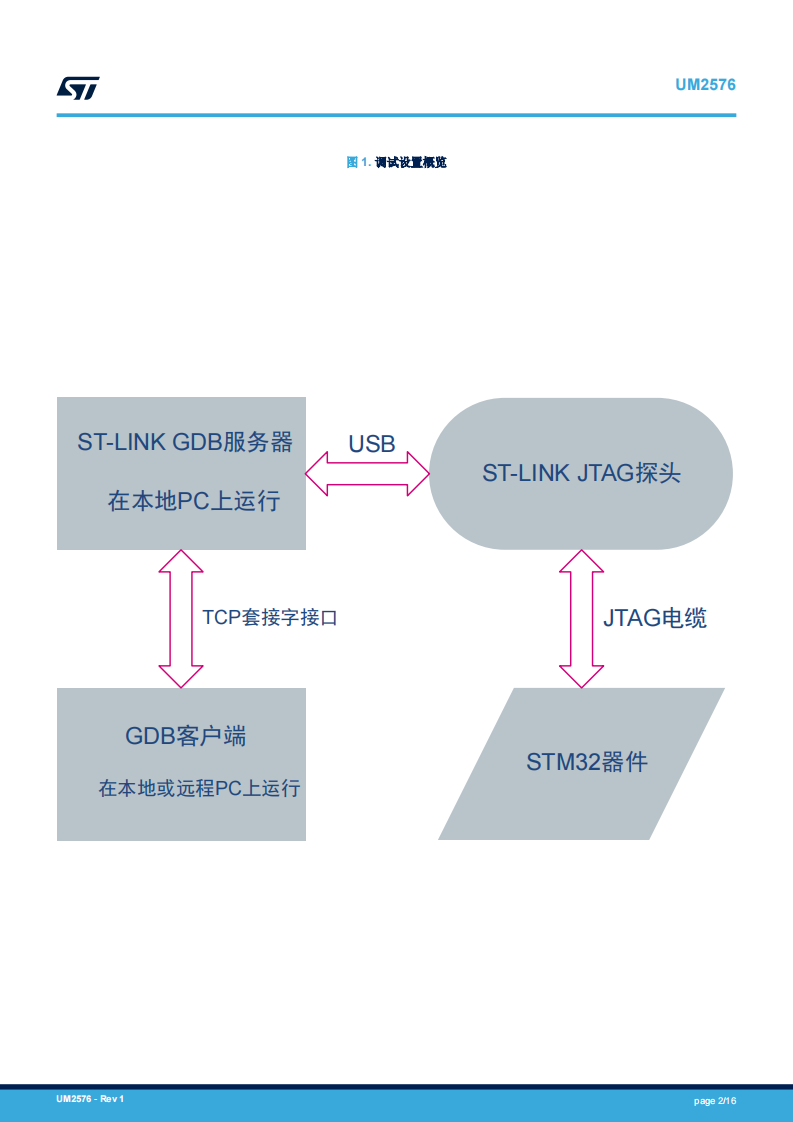 ST-LINK GDB server 启动时会通过 ST-LINK JTAG 连接至 STM32 Arm® Cortex®-M 目标设备。与目标设备侧建立通信之后,将等待客户端连接至 TCP 监听套接字。客户端连接至 TCP 监听套接字之后,ST-LINK GDB server 将处理客户端发送的远程串行通信协议(RSP)消息,并对目标设备侧执行适当操作,随后向客户端回复 RSP。