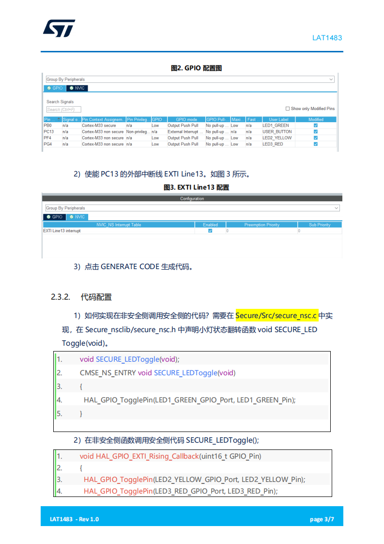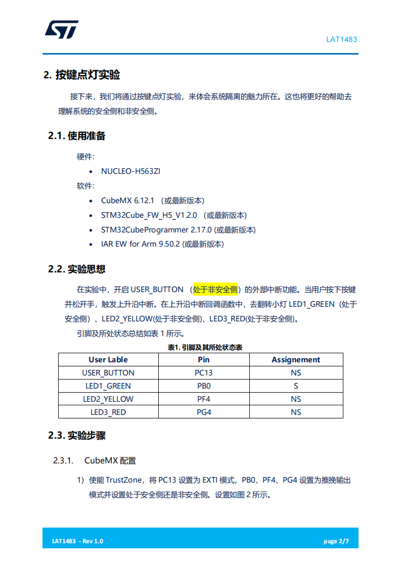 在实验中,开启 USER_BUTTON (处于非安全侧)的外部中断功能。当用户按下按键并松开手,触发上升沿中断。在上升沿中断回调函数中,去翻转小灯 LED1_GREEN(处于安全侧)、LED2_YELLOW(处于非安全侧)、LED3_RED(处于非安全侧)。