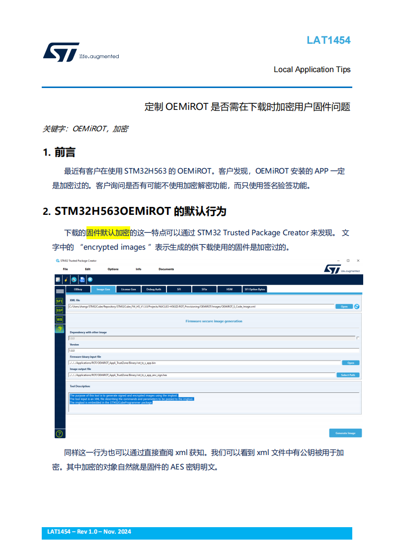 下载的固件默认加密的这一特点可以通过 STM32 Trusted Package Creator 来发现。 文字中的 “encrypted images ”表示生成的供下载使用的固件是加密过的。