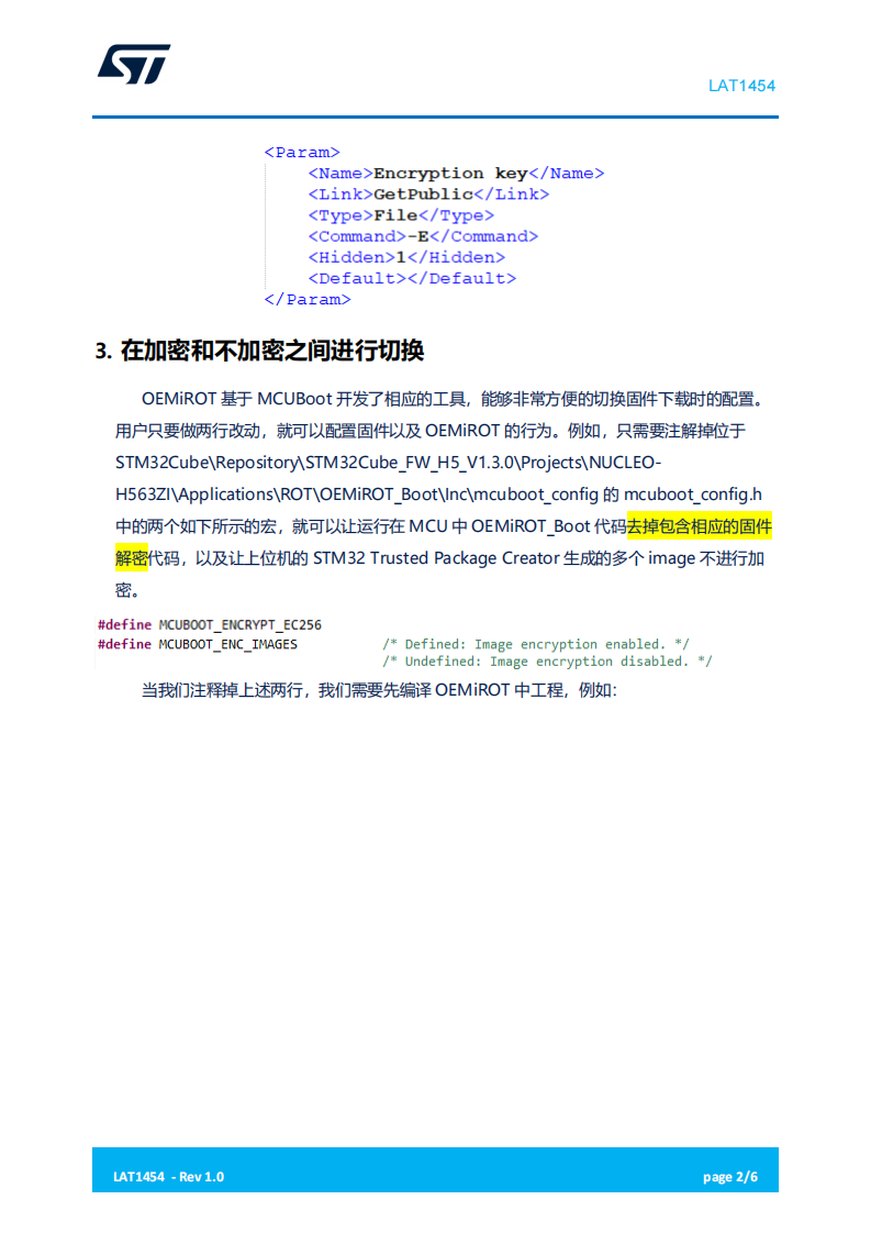 OEMiROT 基于 MCUBoot 开发了相应的工具,能够非常方便的切换固件下载时的配置。用户只要做两行改动,就可以配置固件以及 OEMiROT 的行为。例如,只需要注解掉位于STM32CubeRepositorySTM32Cube_FW_H5_V1.3.0ProjectsNUCLEOH563ZIApplicationsROTOEMiROT_BootIncmcuboot_config 的 mcuboot_config.h中的两个如下所示的宏,就可以让运行在 MCU 中 OEMiROT_Boot 代码去掉包含相应的固件解密代码,以及让上位机的 STM32 Trusted Package Creator 生成的多个 image 不进行加密。