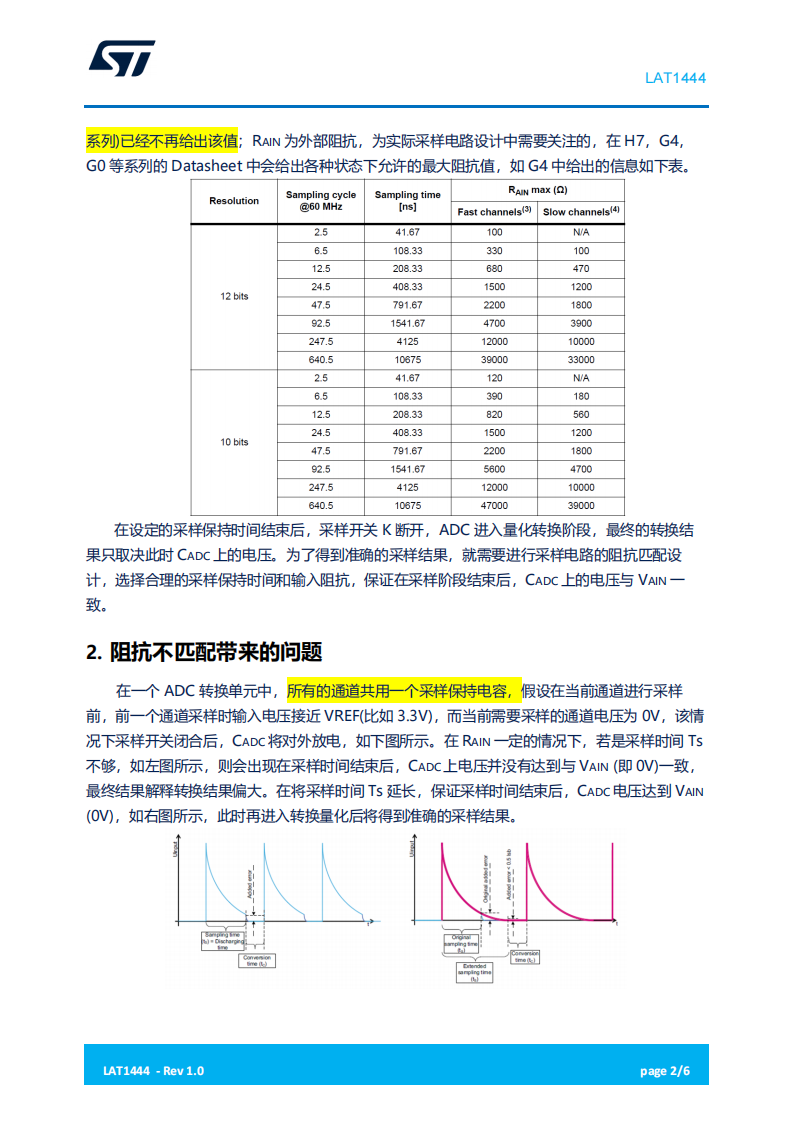 在一个 ADC 转换单元中,所有的通道共用一个采样保持电容,假设在当前通道进行采样前,前一个通道采样时输入电压接近 VREF(比如 3.3V),而当前需要采样的通道电压为 0V,该情况下采样开关闭合后,CADC将对外放电。