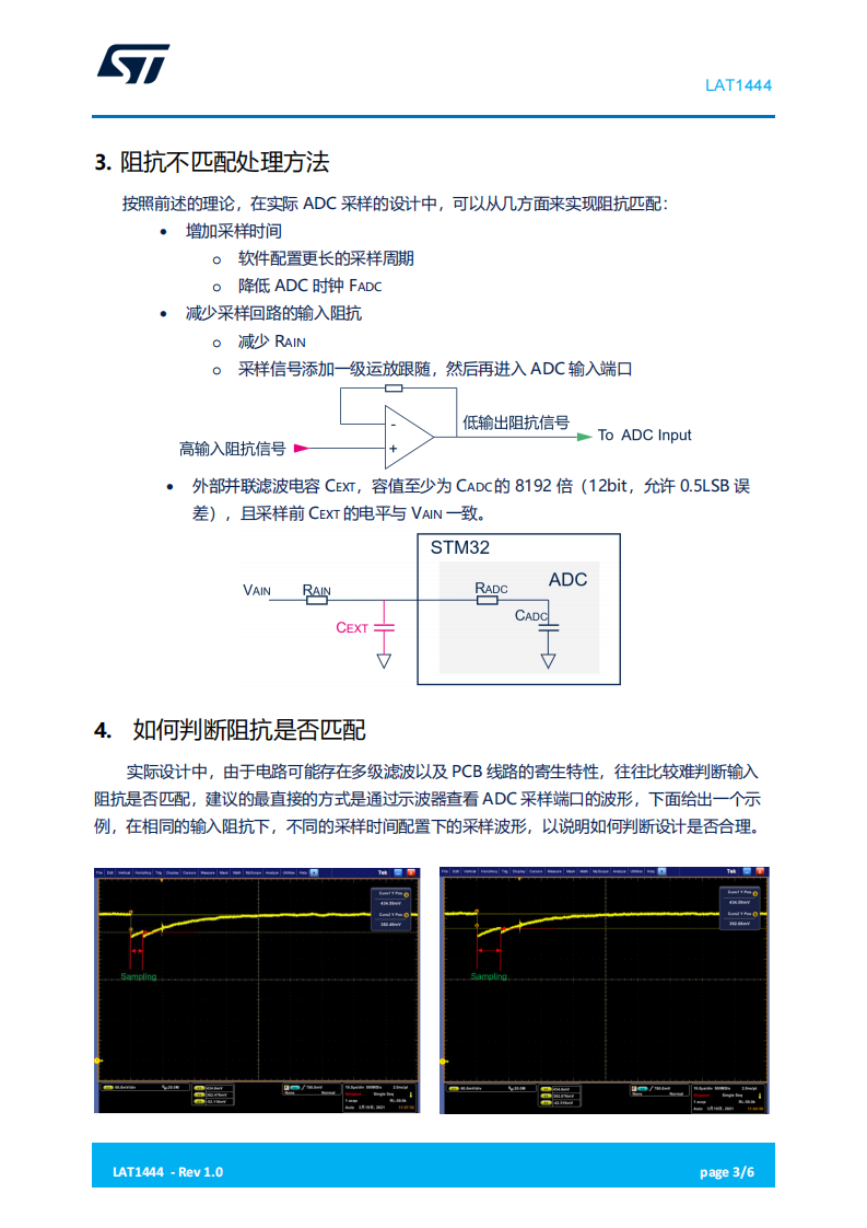 实际设计中,由于电路可能存在多级滤波以及 PCB 线路的寄生特性,往往比较难判断输入阻抗是否匹配,建议的最直接的方式是通过示波器查看 ADC 采样端口的波形,下面给出一个示例,在相同的输入阻抗下,不同的采样时间配置下的采样波形,以说明如何判断设计是否合理。