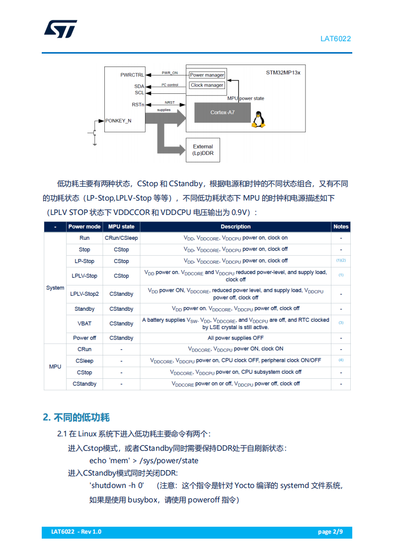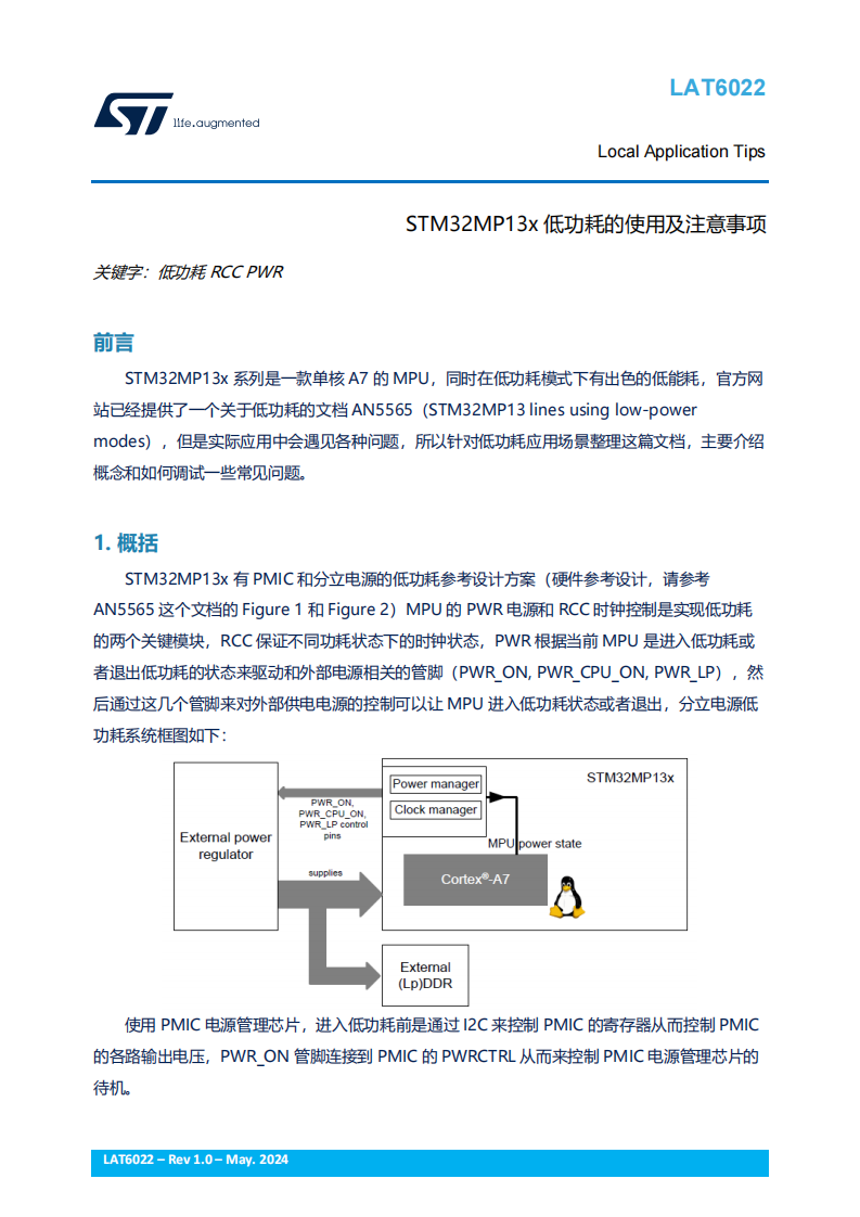 STM32MP13x 系列是一款单核 A7 的 MPU,同时在低功耗模式下有出色的低能耗,官方网站已经提供了一个关于低功耗的文档 AN5565(STM32MP13 lines using low-powermodes),但是实际应用中会遇见各种问题,所以针对低功耗应用场景整理这篇文档,主要介绍概念和如何调试一些常见问题。