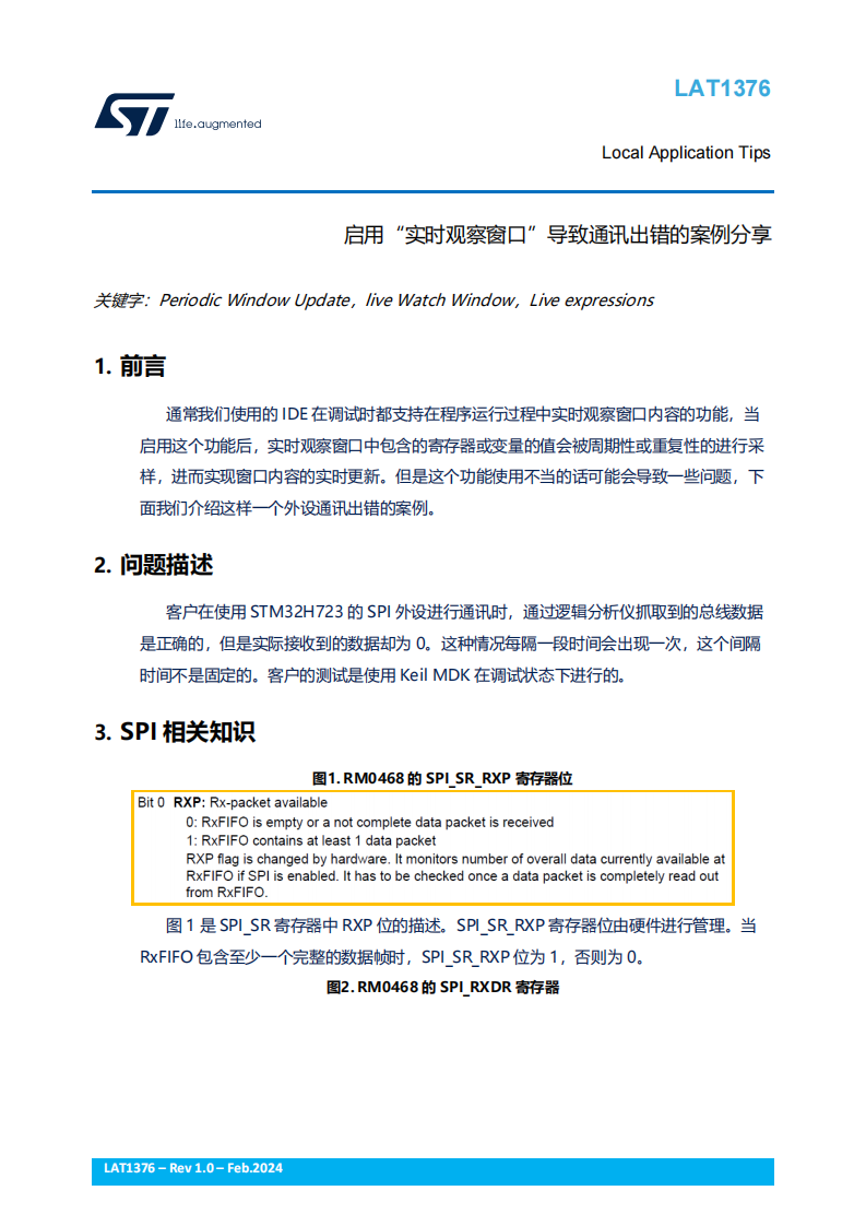 客户在使用 STM32H723 的 SPI 外设进行通讯时,通过逻辑分析仪抓取到的总线数据是正确的,但是实际接收到的数据却为 0。这种情况每隔一段时间会出现一次,这个间隔时间不是固定的。客户的测试是使用 Keil MDK 在调试状态下进行的。