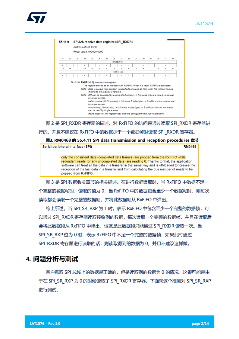 客户抓取 SPI 总线上的数据是正确的,但是读取到的数据为 0 的情况,这很可能是由于在 SPI_SR_RXP 为 0 的时候读取了 SPI_RXDR 寄存器。下面就这个推测对 SPI_SR_RXP进行测试。