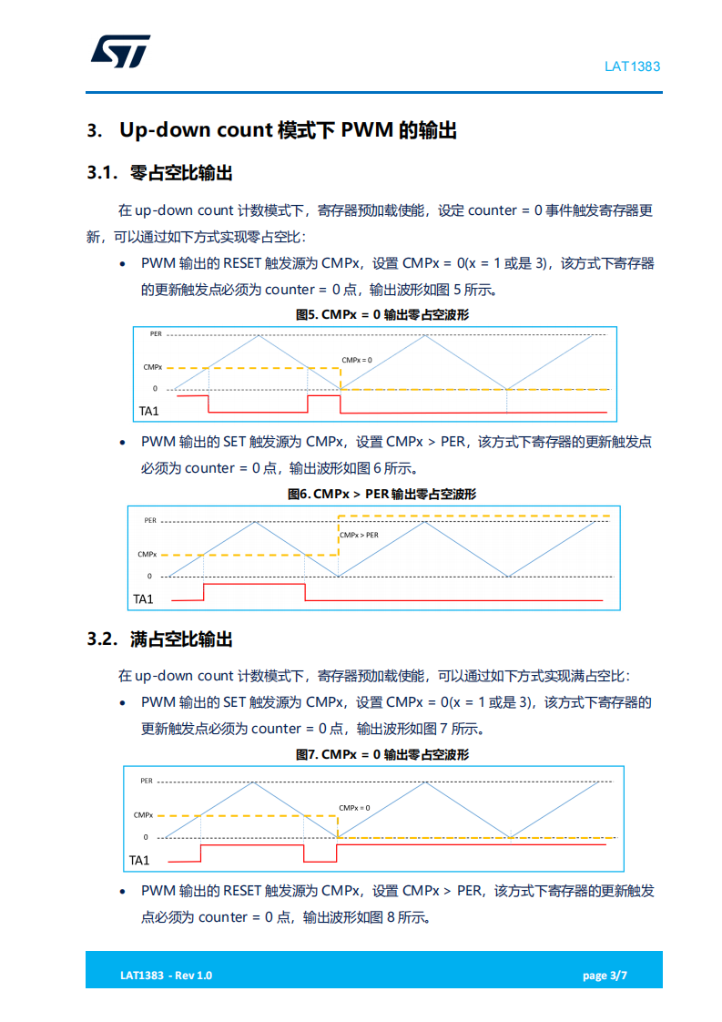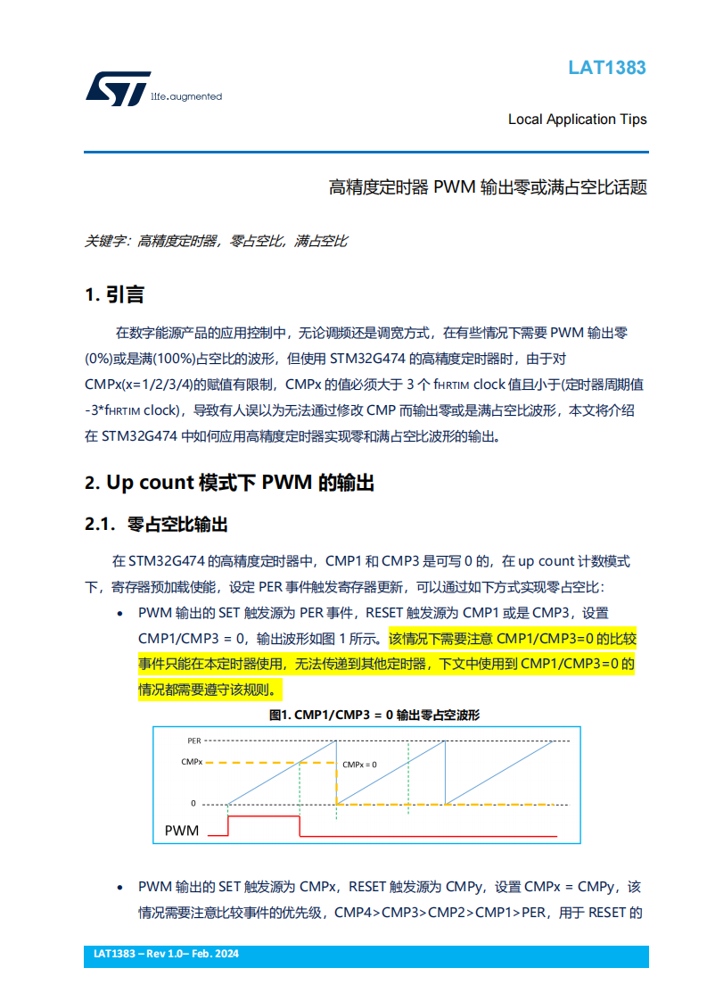 本篇结合高精度定时器的 up 和 up-down 计数方式,分别给出了如何输出零占空比和满占空比 PWM 波形的方法,以及各种方法在应用时的注意事项。