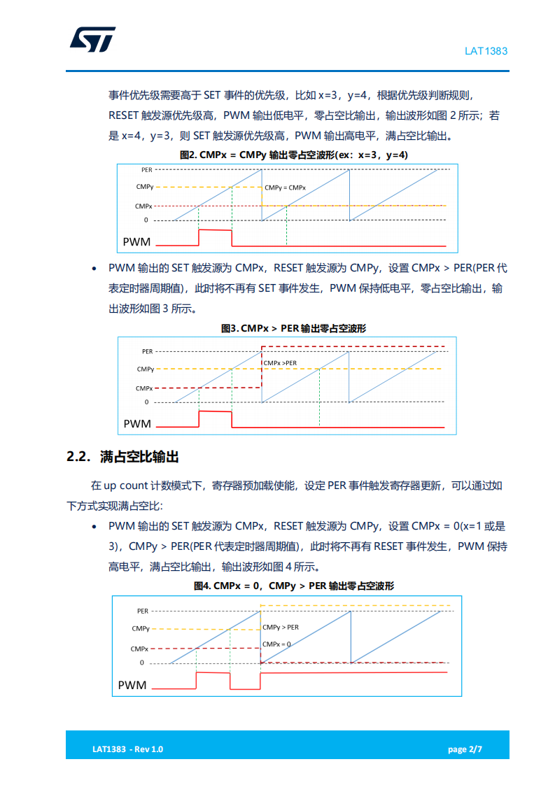 使用 SST/SRT 时,需要注意的是该位不能被预加载,置位后将立即生效,使 PWM 的电平发生变化,如果应用中对 PWM 翻转动作点有严格限制,比如必须在计数器为 0 的时刻发生变化,则使用该方法比较难以实现要求。