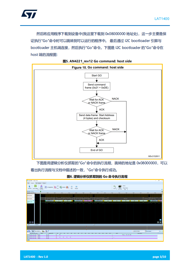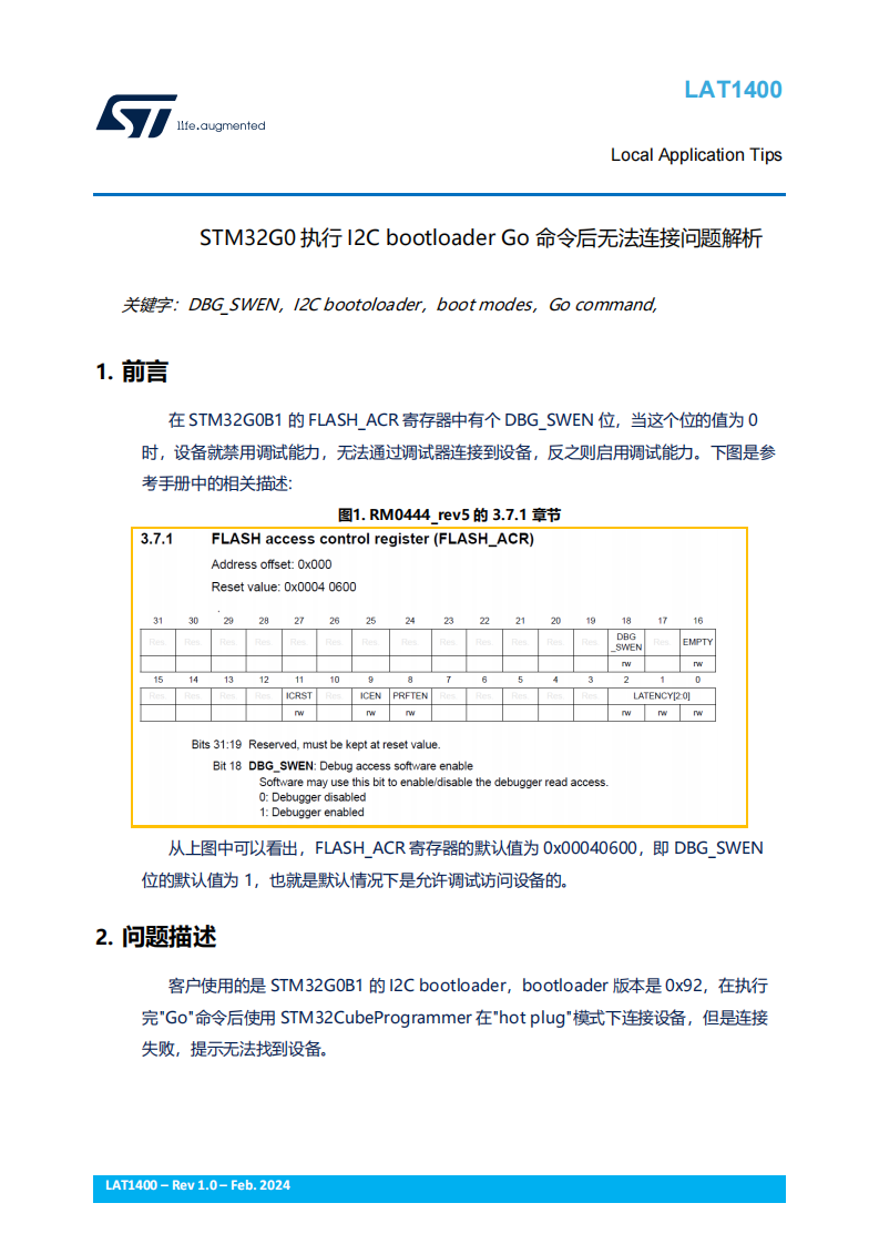 在下载到设备的应用程序中添加打印 FLASH_ACR 寄存器的 DBG_SWEN 位的操作,用来查看执行完 I2C bootloader 的"Go"命令后的 DBG_SWEN 的状态。