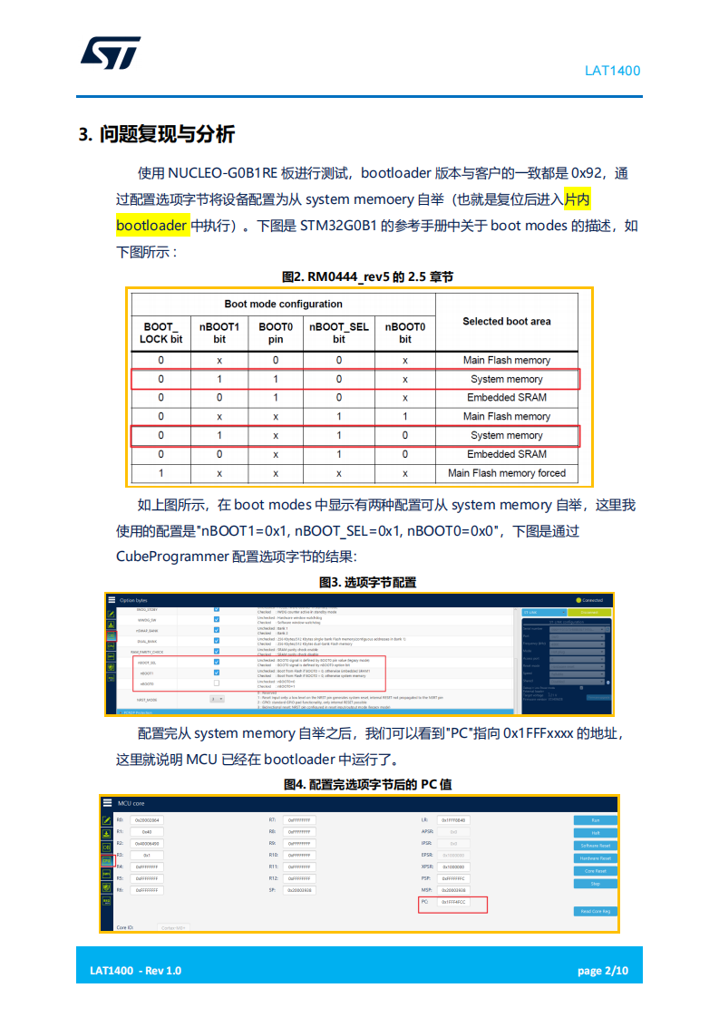 使用 NUCLEO-G0B1RE 板进行测试,bootloader 版本与客户的一致都是 0x92,通过配置选项字节将设备配置为从 system memoery 自举(也就是复位后进入片内bootloader 中执行)。
