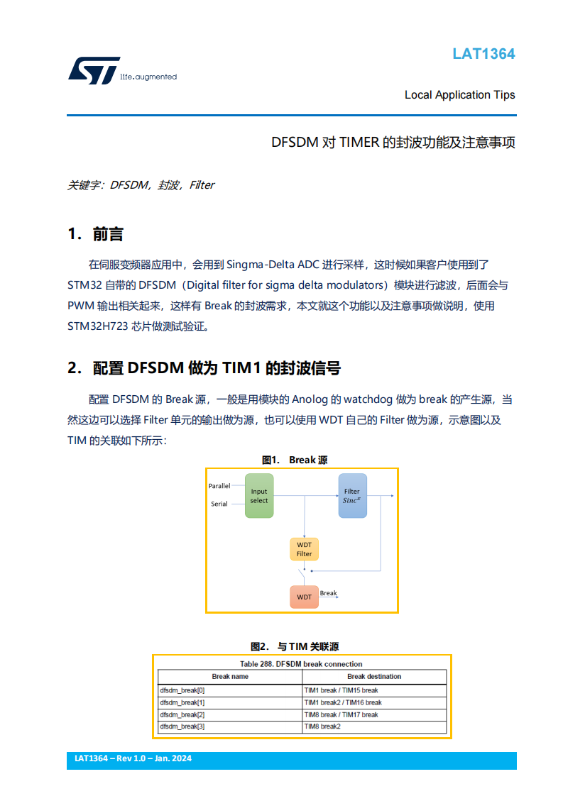 在伺服变频器应用中,会用到 Singma-Delta ADC 进行采样,这时候如果客户使用到了STM32 自带的 DFSDM(Digital filter for sigma delta modulators)模块进行滤波,后面会与PWM 输出相关起来,这样有 Break 的封波需求,本文就这个功能以及注意事项做说明,使用STM32H723 芯片做测试验证。