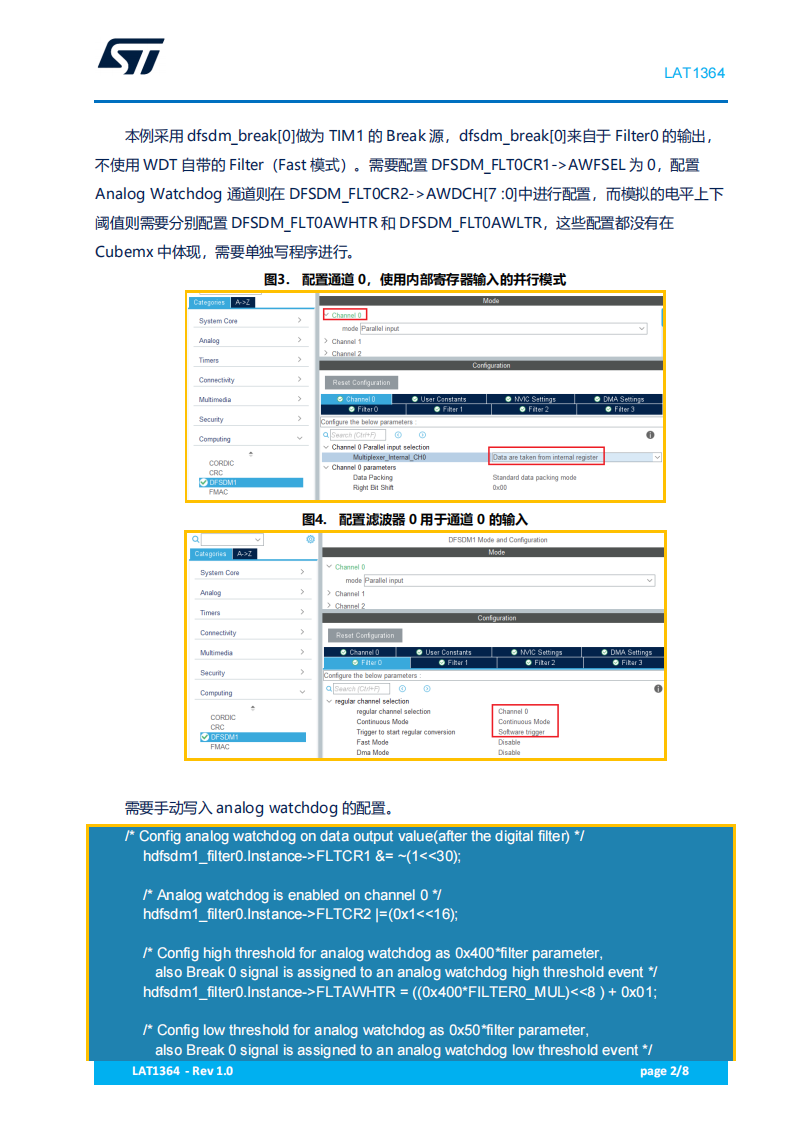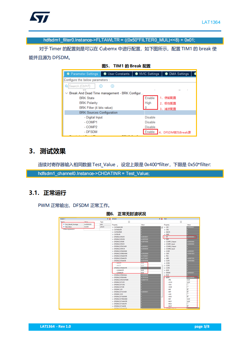本例中详细介绍了如何配置 DFSDM 的输出做为 TIM1 的封波功能,并且强调不能对来自DFSDM 的 break 源使用 TIMER 的 break 滤波,上面配置供客户参考。另外本例子中 DFSDM 的配置是测试模式,实际使用过程中客户会使用到串行输入功能,详细使用说明可参考 AN4990 以及芯片的参考手册。