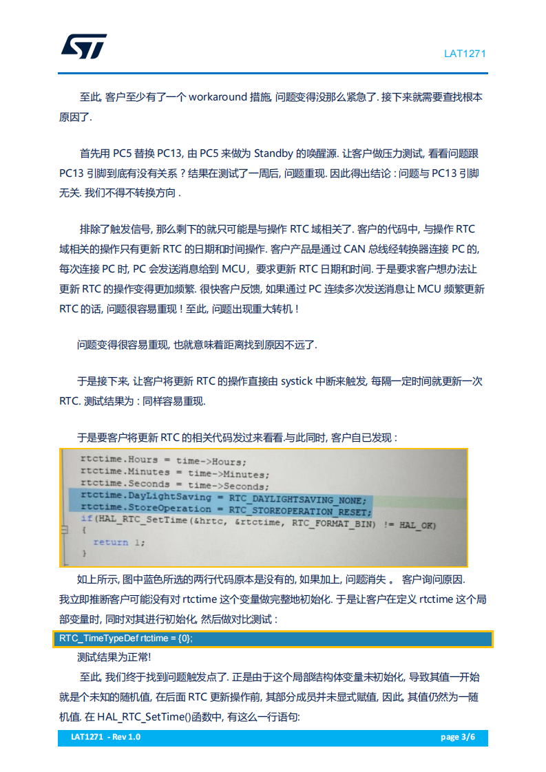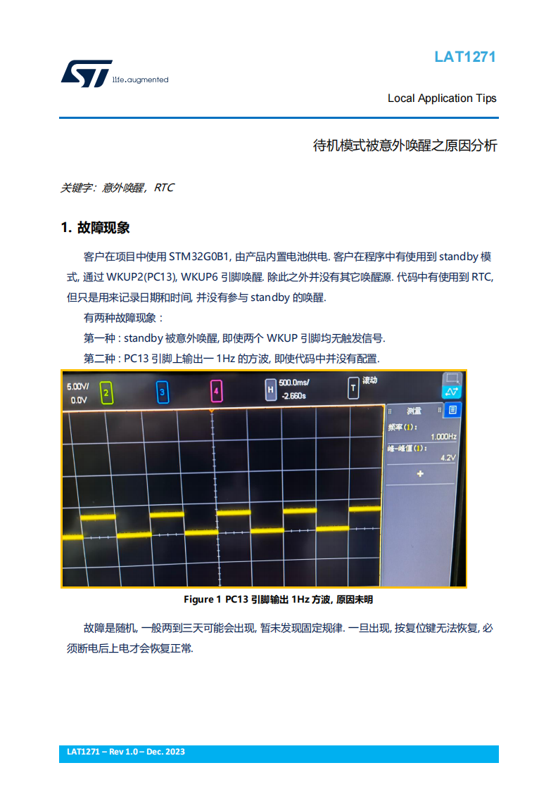 客户在项目中使用 STM32G0B1, 由产品内置电池供电. 客户在程序中有使用到 standby 模式, 通过 WKUP2(PC13), WKUP6 引脚唤醒. 除此之外并没有其它唤醒源. 代码中有使用到 RTC,但只是用来记录日期和时间, 并没有参与 standby 的唤醒。