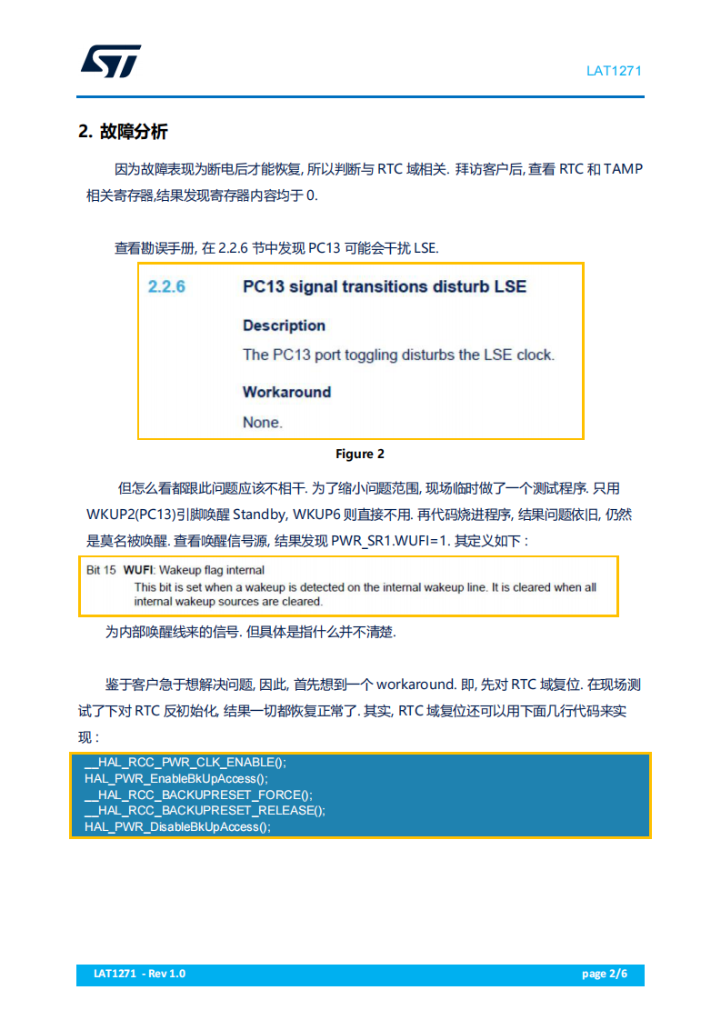 因为故障表现为断电后才能恢复, 所以判断与 RTC 域相关. 拜访客户后, 查看 RTC 和 TAMP相关寄存器,结果发现寄存器内容均于 0。