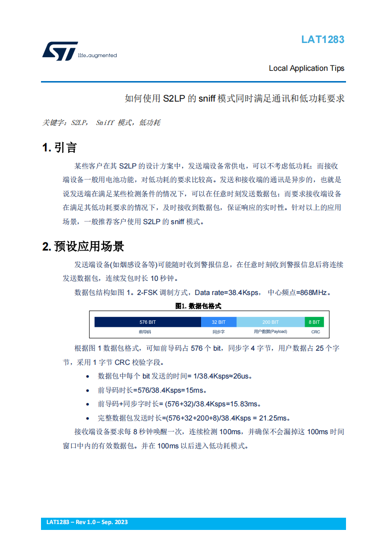 某些客户在其 S2LP 的设计方案中,发送端设备常供电,可以不考虑低功耗;而接收端设备一般用电池功能,对低功耗的要求比较高。发送和接收端的通讯是异步的,也就是说发送端在满足某些检测条件的情况下,可以在任意时刻发送数据包;而要求接收端设备在满足其低功耗要求的情况下,及时接收到数据包,保证响应的实时性。针对以上的应用场景,一般推荐客户使用 S2LP 的 sniff 模式。