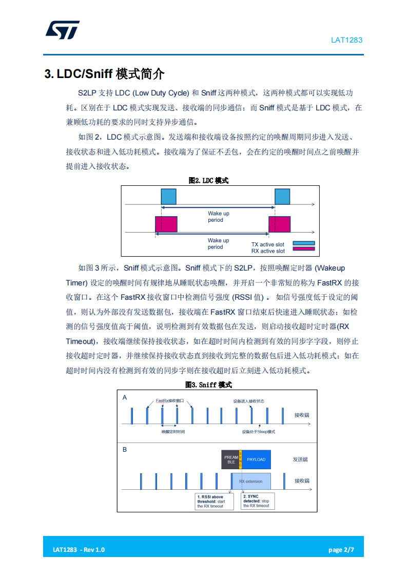 S2LP 支持 LDC (Low Duty Cycle) 和 Sniff 这两种模式,这两种模式都可以实现低功耗。区别在于 LDC 模式实现发送、接收端的同步通信;而 Sniff 模式是基于 LDC 模式,在兼顾低功耗的要求的同时支持异步通信。