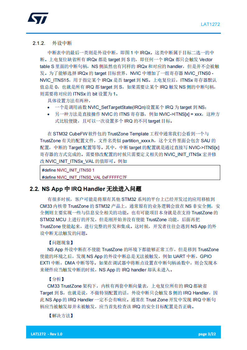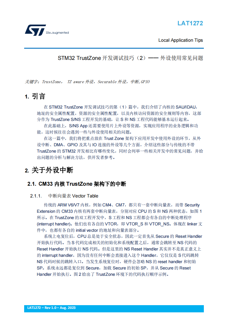 在这一篇中,我们将把重点放在 Trust Zone 架构下应用开发中使用外设的环节,从外设中断、DMA、GPIO 及其与 IO 连接的外设等几个方面,介绍这些部分与传统的不带TrustZone 的 STM32 开发相比有哪些变化,同时会列举一些相关开发中的常见问题,并给出问题的分析与解决方法,供开发者参考。