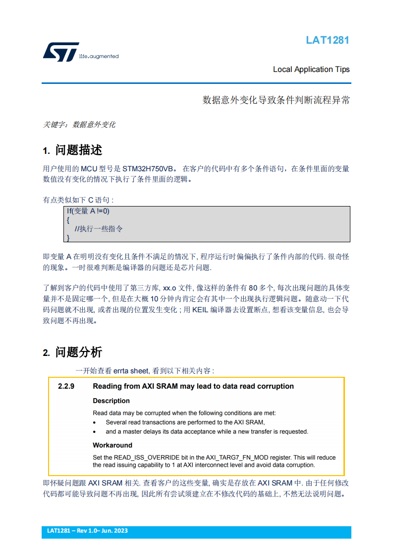 用户使用的 MCU 型号是 STM32H750VB。 在客户的代码中有多个条件语句,在条件里面的变量数值没有变化的情况下执行了条件里面的逻辑。