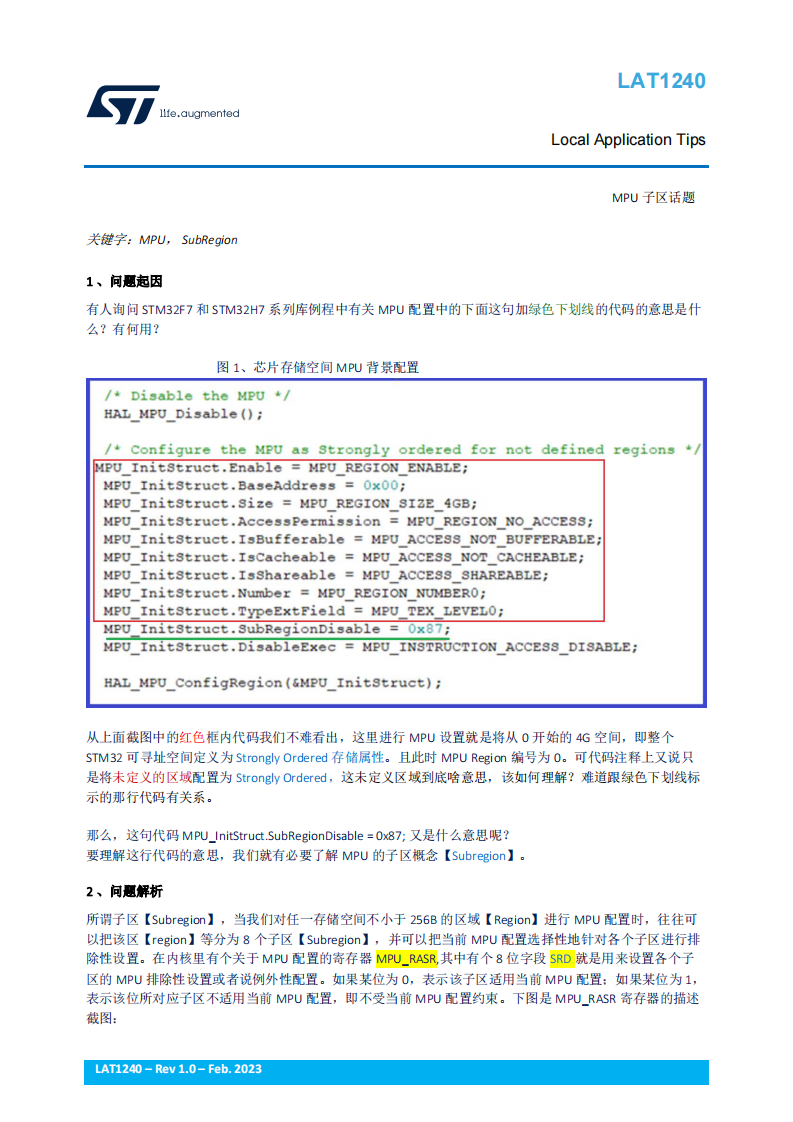 本篇内容主要涉及内核 MPU 配置方面的东西,重点针对客户的疑问做了些解答,对 MPU 配置中的子区概念做了较为详细的解读,以供参考。