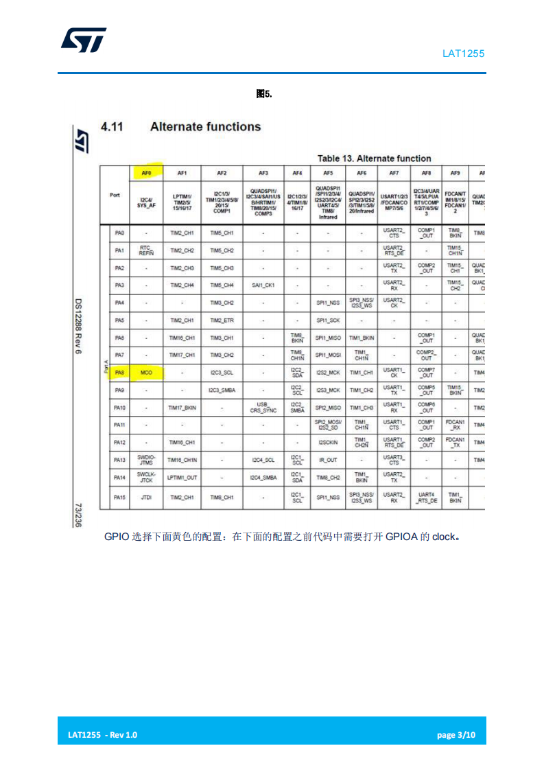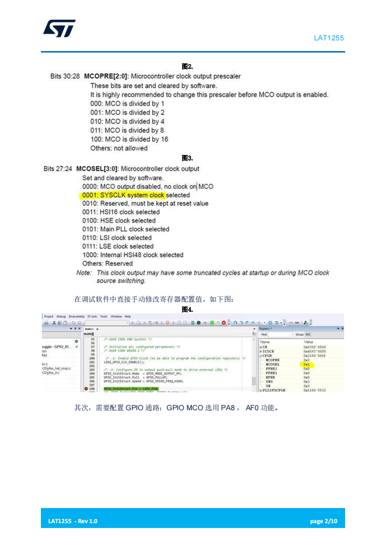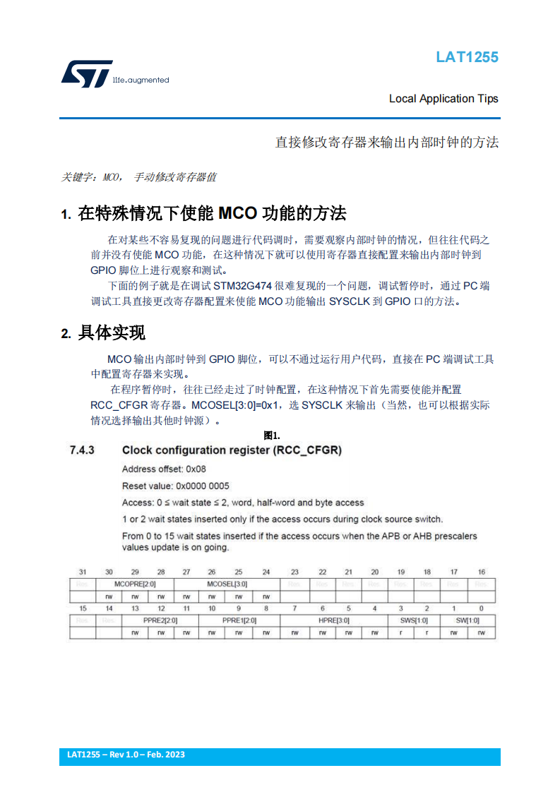 在程序暂停时,往往已经走过了时钟配置,在这种情况下首先需要使能并配置RCC_CFGR 寄存器。MCOSEL[3:0]=0x1,选 SYSCLK 来输出(当然,也可以根据实际情况选择输出其他时钟源)。