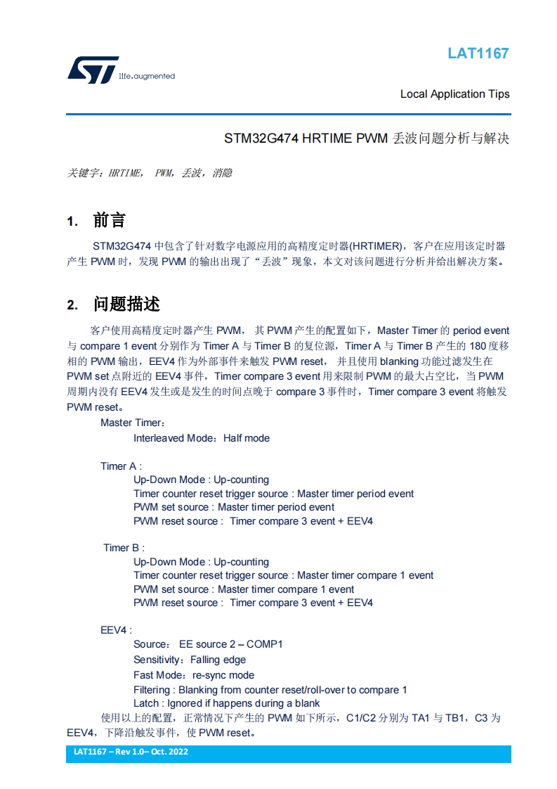 STM32G474 中包含了针对数字电源应用的高精度定时器(HRTIMER),客户在应用该定时器产生 PWM 时,发现 PWM 的输出出现了“丢波”现象,本文对该问题进行分析并给出解决方案。