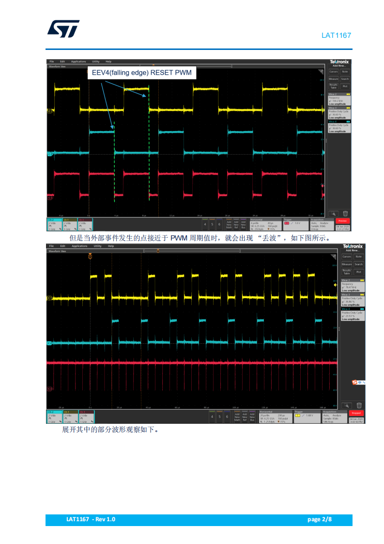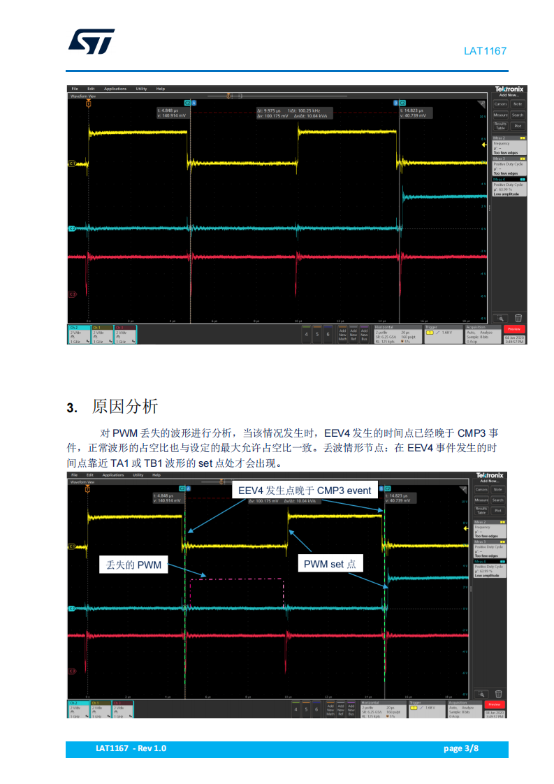 对 PWM 丢失的波形进行分析,当该情况发生时,EEV4 发生的时间点已经晚于 CMP3 事件,正常波形的占空比也与设定的最大允许占空比一致。丢波情形节点:在 EEV4 事件发生的时间点靠近 TA1 或 TB1 波形的 set 点处才会出现。