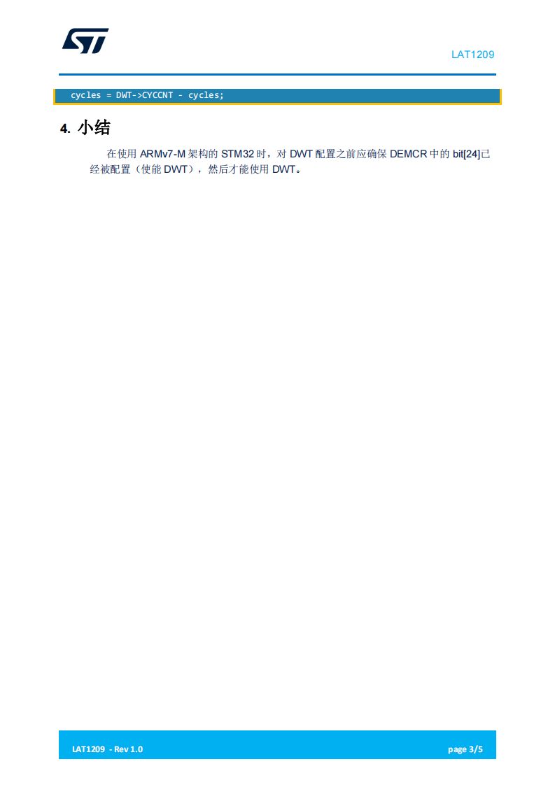 在使用 ARMv7-M 架构的 STM32 时,对 DWT 配置之前应确保 DEMCR 中的 bit[24]已经被配置(使能 DWT),然后才能使用 DWT。