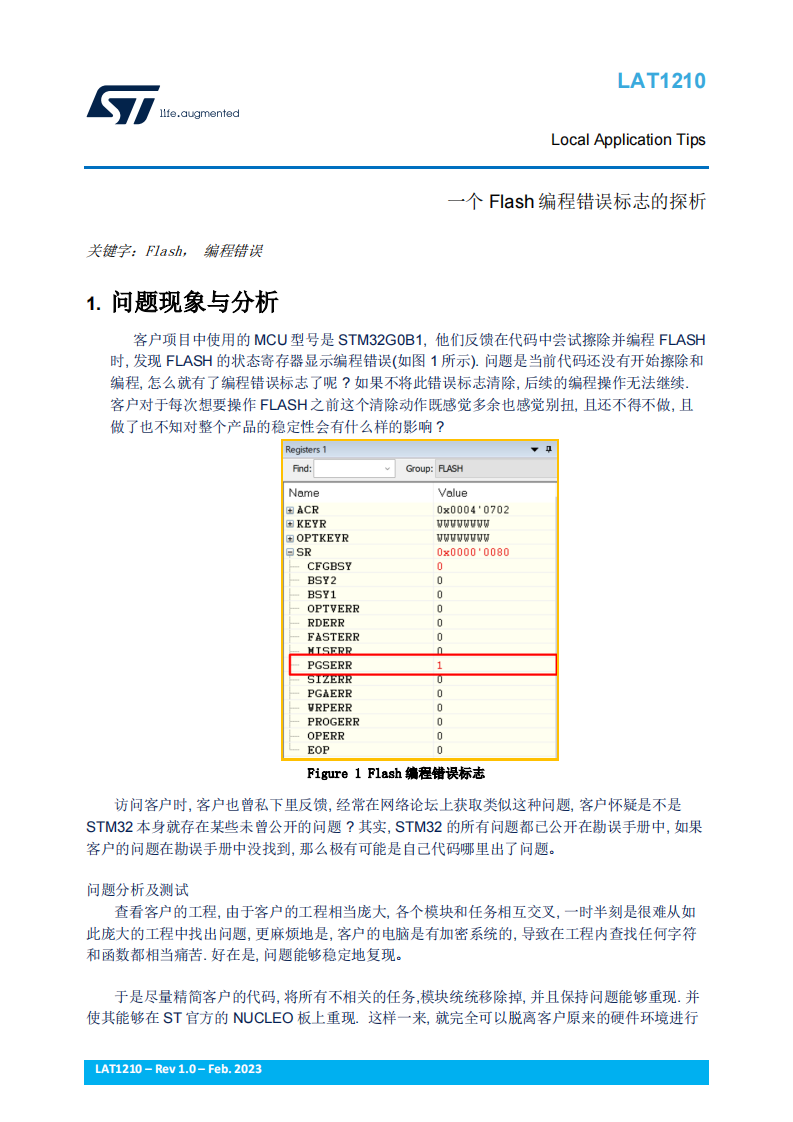 客户项目中使用的 MCU 型号是 STM32G0B1, 他们反馈在代码中尝试擦除并编程 FLASH时, 发现 FLASH 的状态寄存器显示编程错误(如图 1 所示). 问题是当前代码还没有开始擦除和编程, 怎么就有了编程错误标志了呢 ? 如果不将此错误标志清除, 后续的编程操作无法继续.客户对于每次想要操作 FLASH 之前这个清除动作既感觉多余也感觉别扭, 且还不得不做, 且做了也不知对整个产品的稳定性会有什么样的影响 ?