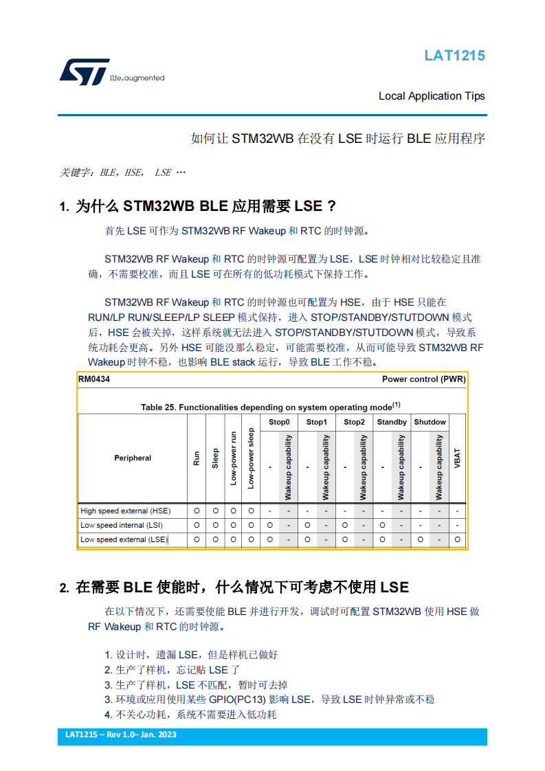 STM32WB RF Wakeup 和 RTC 的时钟源也可配置为 HSE,由于 HSE 只能在RUN/LP RUN/SLEEP/LP SLEEP 模式保持,进入 STOP/STANDBY/STUTDOWN 模式后,HSE 会被关掉,这样系统就无法进入 STOP/STANDBY/STUTDOWN 模式,导致系统功耗会更高。另外 HSE 可能没那么稳定,可能需要校准,从而可能导致 STM32WB RFWakeup 时钟不稳,也影响 BLE stack 运行,导致 BLE 工作不稳。