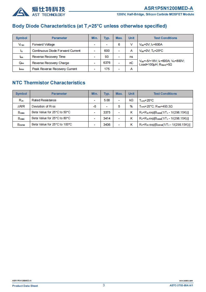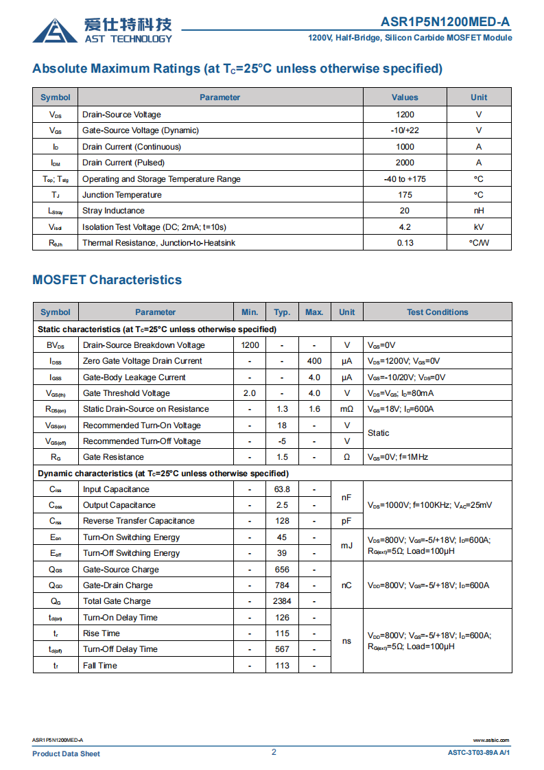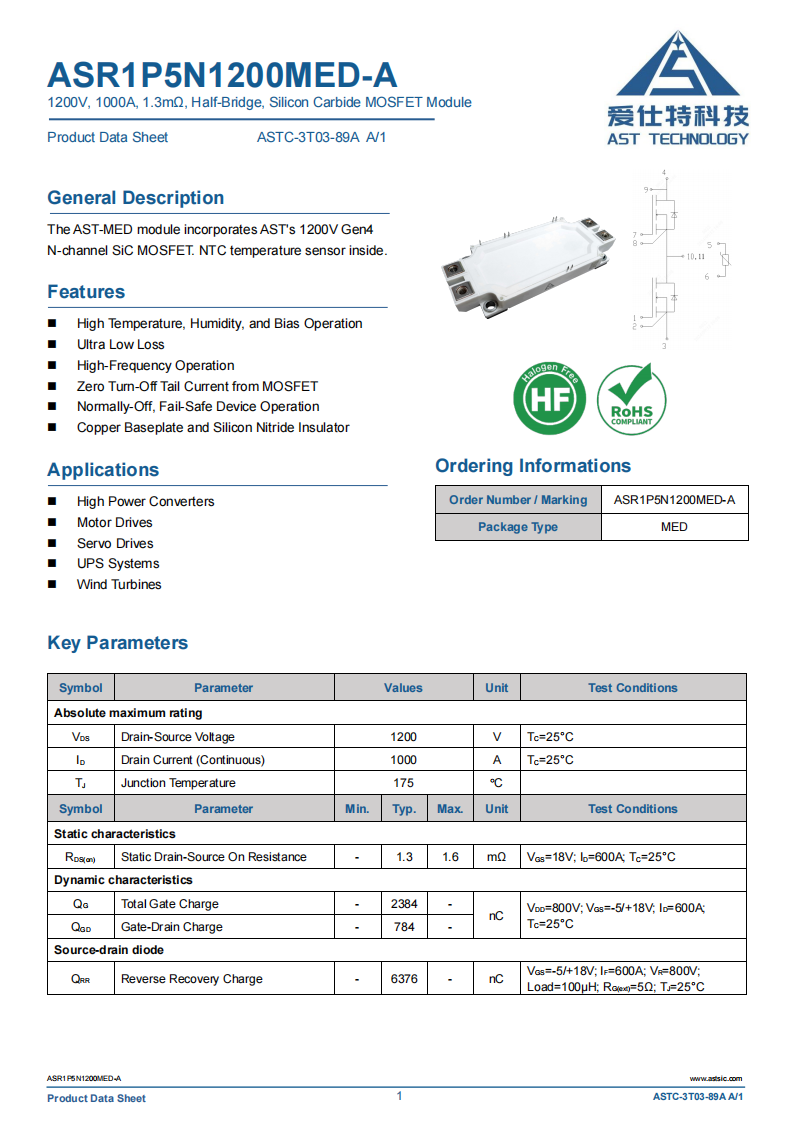 ASR1P5N1200MED-A(Ed3)碳化硅(SiC)1000A功率模块
