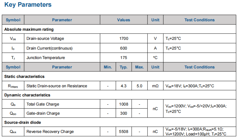 4. 参数范围: VDS:1700V ID:600A RDS(on) :4.3mΩ