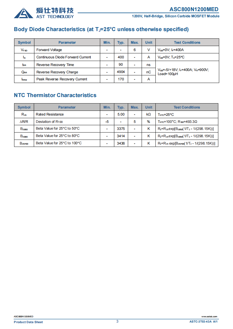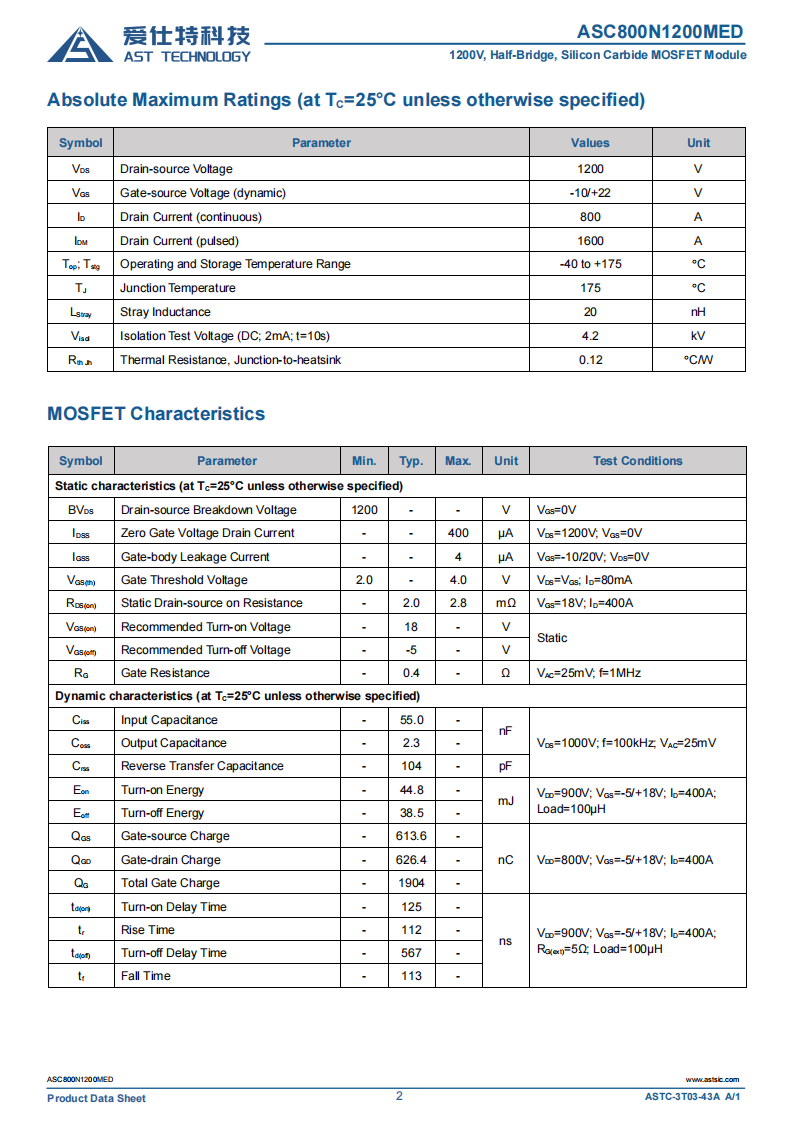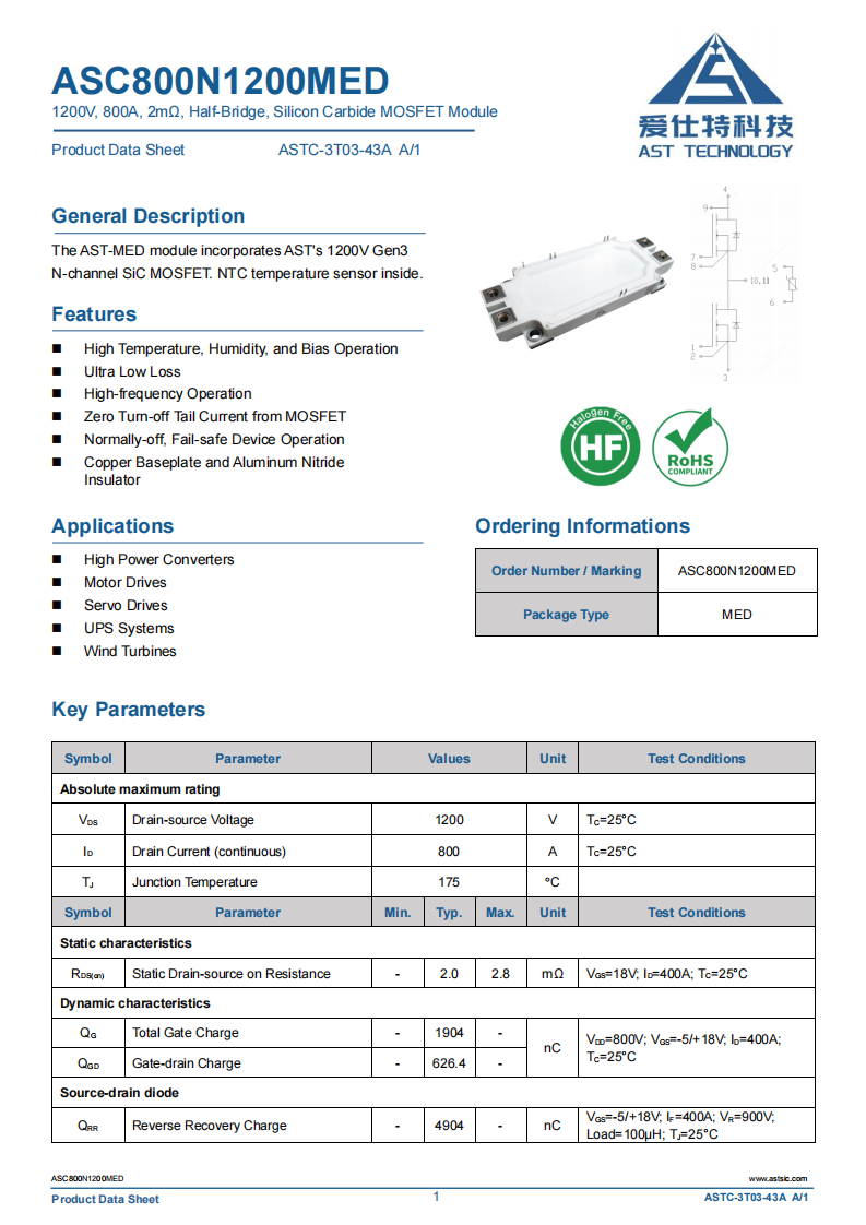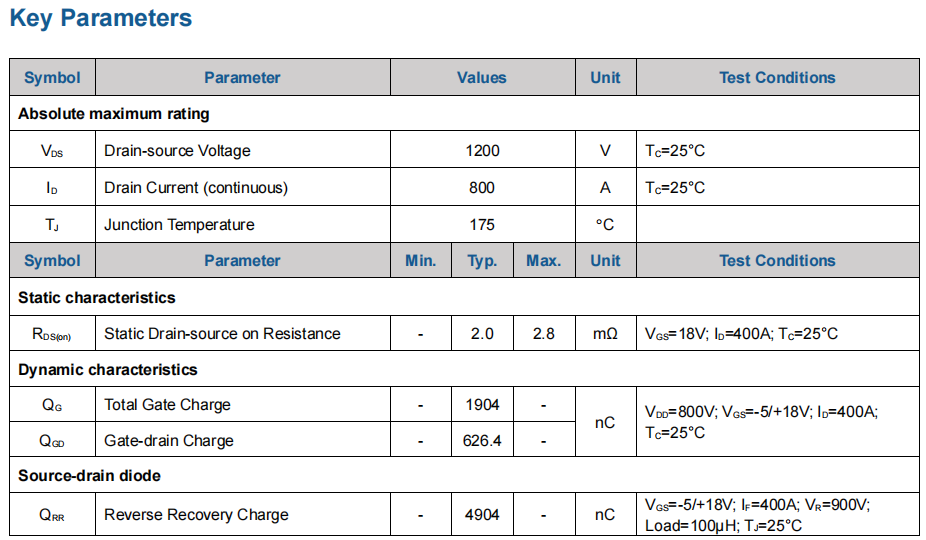 4. 参数范围: VDS:1200V ID:800A RDS(on) :2mΩ