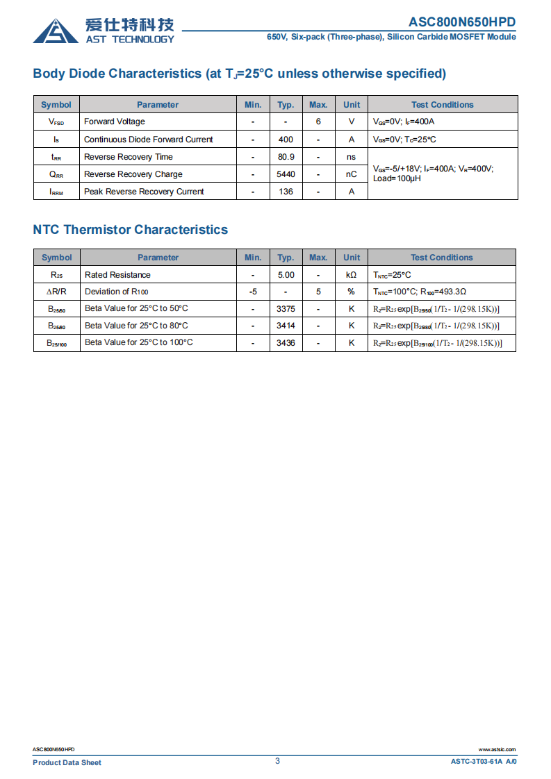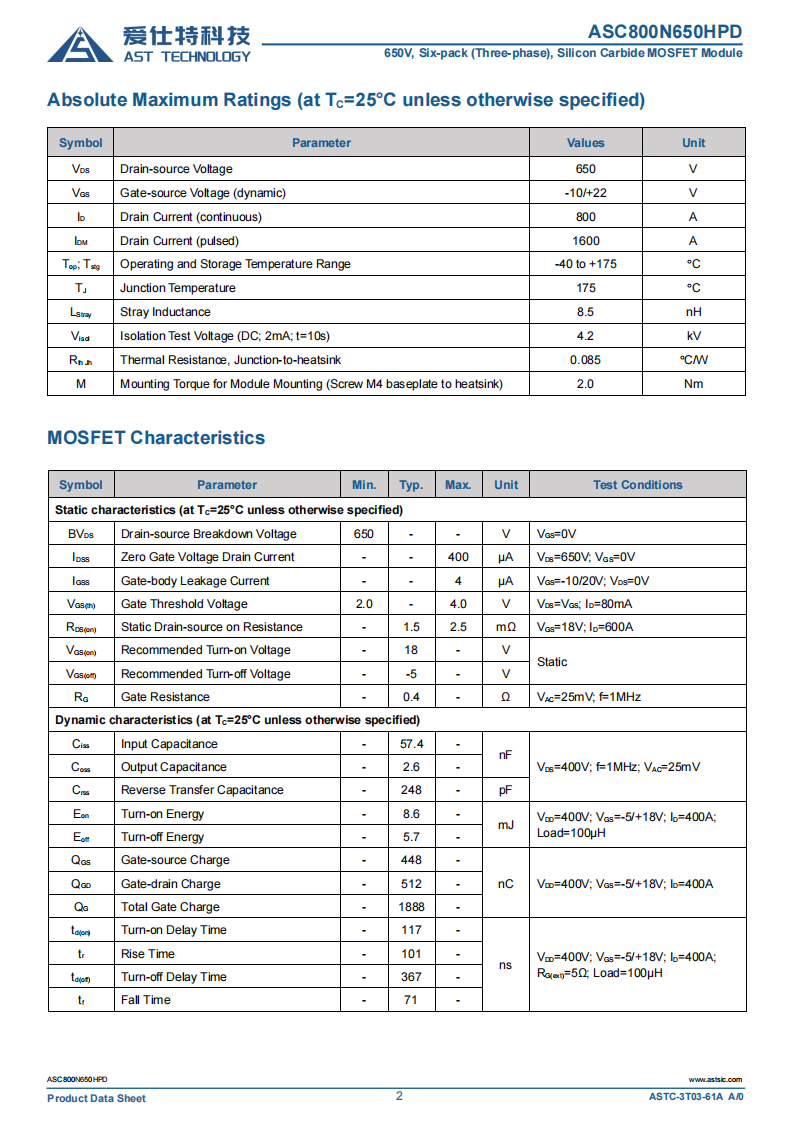 3. 参数范围: VDS:650V ID:800A RDS(on) :1.5mΩ