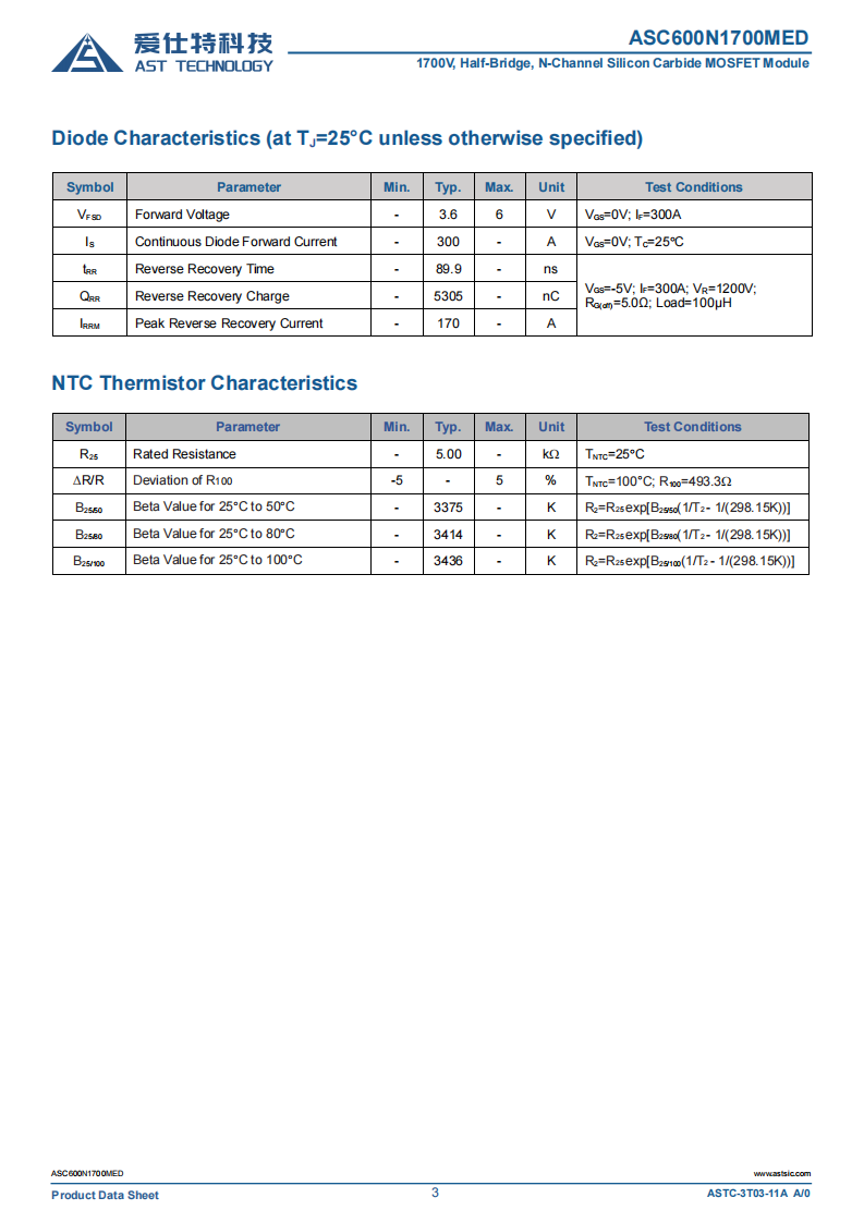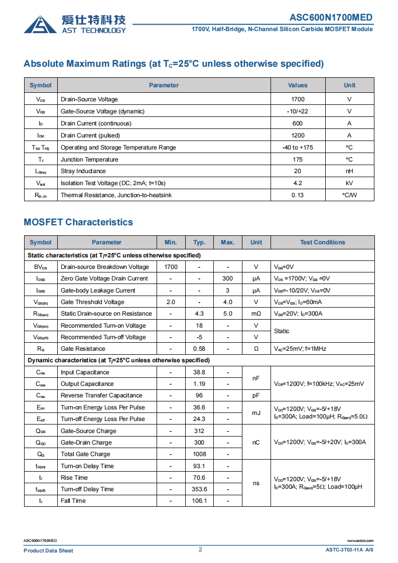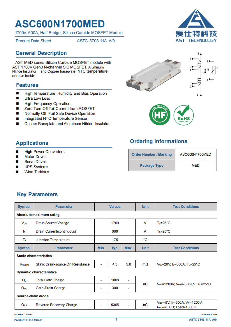 ASC600N1700MED碳化硅模块ED3:1700V600A