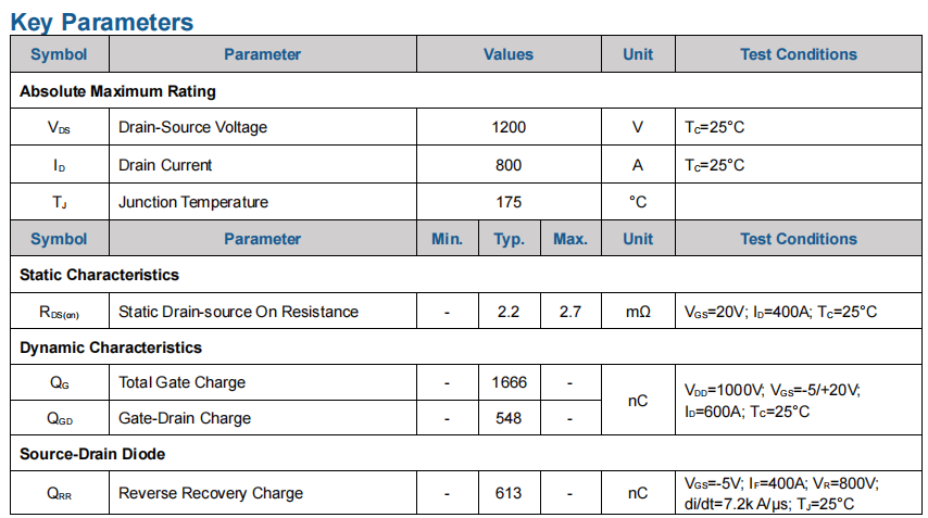 3. 参数: VDS:1200V ID:800A RDS(on) :2mΩ