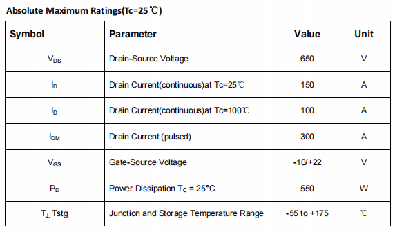 3. 参数范: VDS:650V ID:150A RDS(on) :12mΩ