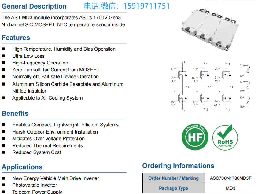 扫码加入ASC700N1700MD3F碳化硅(SiC)模块6单元1700V风冷散热700A