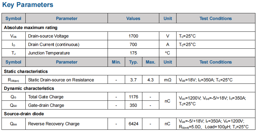 3. 参数范围: VDS:1700V ID:700A RDS(on) :3.7mΩ