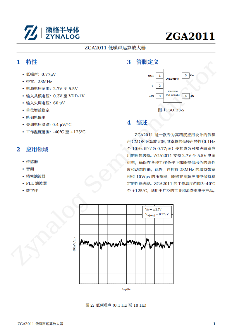 ZGA2011 是一款专为高精度应用设计的低噪声CMOS 运算放大器。其卓越的低噪声特性(0.1Hz至10Hz 时仅为0.77μV)使其成为对噪声敏感应用的理想选择。