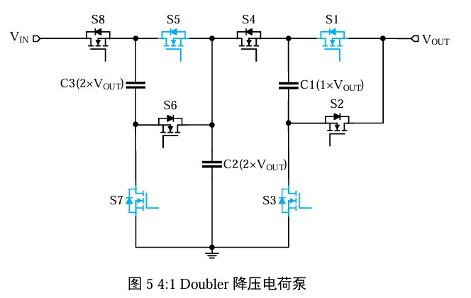 当S1、S3、S5、S7 打开时,S2、S4、S6、S8 均处于关闭状态,C1、S3、S5 构成回路。电流 依次流经S3、C1、S5,最终从 VOUT流出;与此同时,C2、C3、S1、S3、S7 构成回路,电流依次 流经S3、C3、S7、C2、S1,最终从VOUT流出。VOUT流出的平均电流为VIN输入平均电流的2倍。