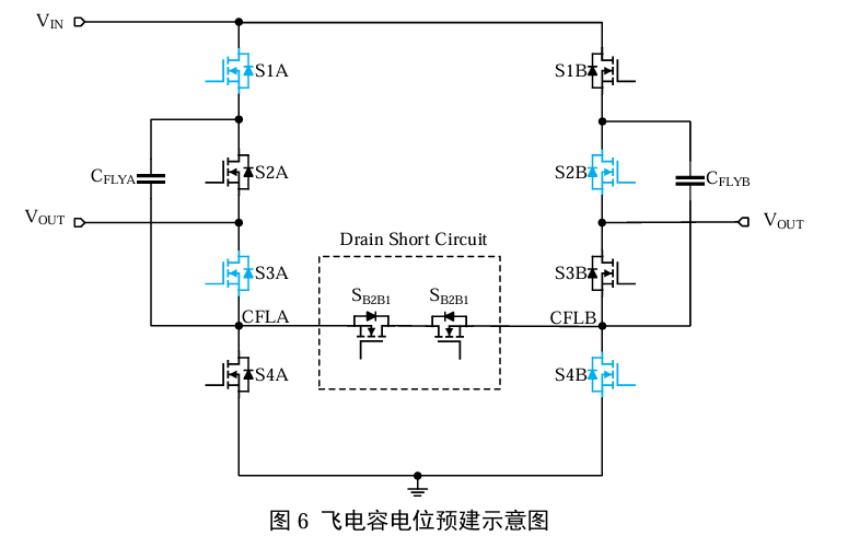 引用文献[2]提出了通过接通处于两个电压段的互补飞电容开关节点,并在下次接通前预先建立飞电容电压的一种方案,以提高电路的效率。如图 6[2]所示,该方案利用背靠背功率管短接 CFLA、 CFLB 节点,使得处于不同电压段的寄生电容向中间电位拉平,从而实现无损电荷搬移,而无需使用电感。这种方法通过让处于不同电压段的寄生电容互充、减少了最多不超过 1/4 的损失。与利用主开关通道建立新的寄生电容电压相比,该方案在预建电压的同时,也对栅-漏电容充电,从而减少了主开关导通建立时间,实现了比寄生电容充分损失减小更多的效率提升。这种以增加一对开关为代价换取效率改善的方案,已经在一些产品设计中以不同形式得到实现,验证了其效率改善效果。